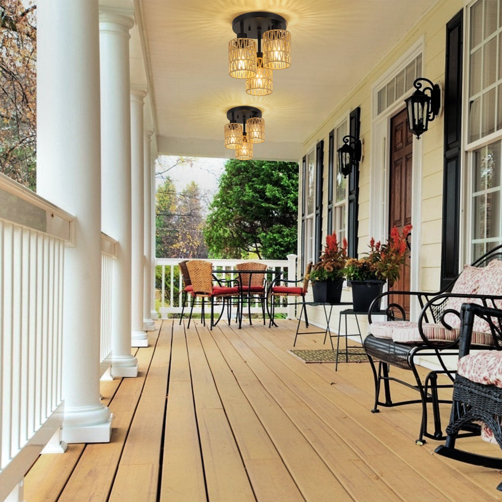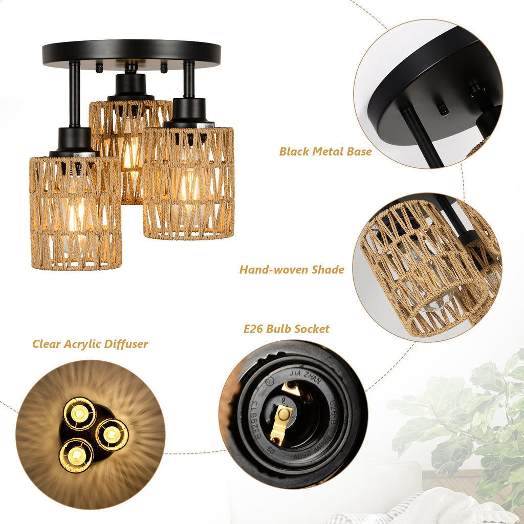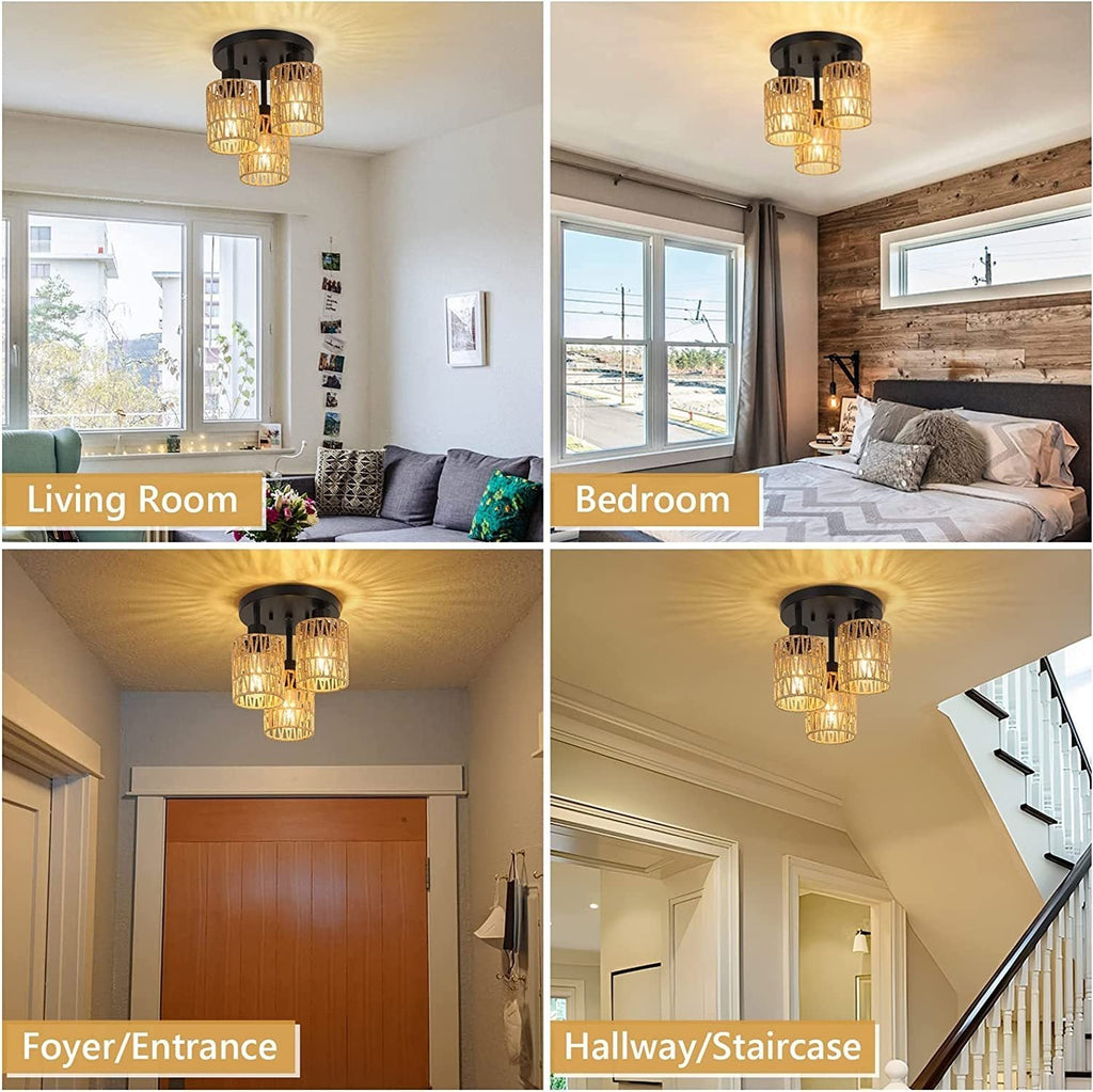 [3-lights rattan light fixture] this semi flush mount ceiling light is made of 100% hand-woven natural rattan and durable metal, which is more eco-friendly, safety, and healthy. Never need to worry about rust, corrosion, or fading. The hollow design of rattan lampshade enables this boho light fixture to emit 360 beautiful light shadow. This light fixtures ceiling mount will bring warm lights and wonderful boho atmosphere to your home! [Unique design & wide application] this unique ceiling light fixture adopts a stepped design of three hand-woven rattan light covers, which is permeated with farmhouse, rustic and boho style. The perfect size of 9.8"(W) x 11.8"(H) provides a great deal of ambient light without sacrificing too much space. The upgraded farmhouse light fixtures will be a great choice for nearly any space such as hallway, entryway, foyer, living room, bedroom, porch, kitchen, closet, etc. [E26 Base & Dimming Function] This rattan chandelier comes with 3 E26 lamp holders. Compatible with Incandescent, CFL, LED, and halogen bulbs (Max 40W, bulbs not included). 3-lights design can direct and focus the light to different angles, allow for maximum light to brighten up your home. And this hallway light fixtures ceiling is also fully dimmable when used with a dimmable bulb and dimmer switch. You can choose different style bulbs and color temperatures to create different atmospheres. [Lamp size & easy installation] overall size: 9.8"(W) x 11.8"(H), lampshade: 4.7"(W)x5.9"(H). The hardwired and sockets are built with premium materials and circuitry, truly high-quality usage for a long time. This rattan ceiling light fixture includes all mounting hardware and instruction for quick and easy installation. You can easily complete the installation of the boho chandelier in just a few minutes!