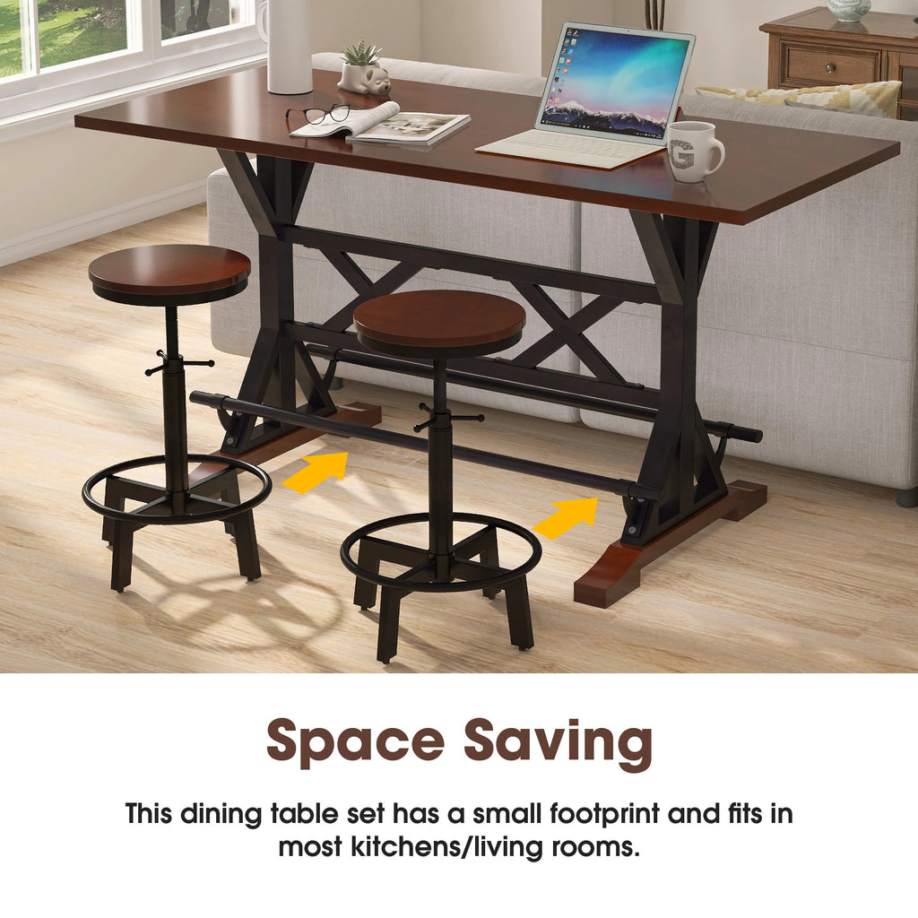 - BAR TABLE AND CHAIR SET: The classic 3-piece dining set has a table and two lift stools. Rectangular design and metal legs reflect the beauty of industrial machinery design; the espresso color table top with natural wood grain presents a rich vintage atmosphere, can be used on a variety of occasions, can accommodate 2 people, kitchen, dining room, dining room, living room can be used, is the perfect decoration for home use.