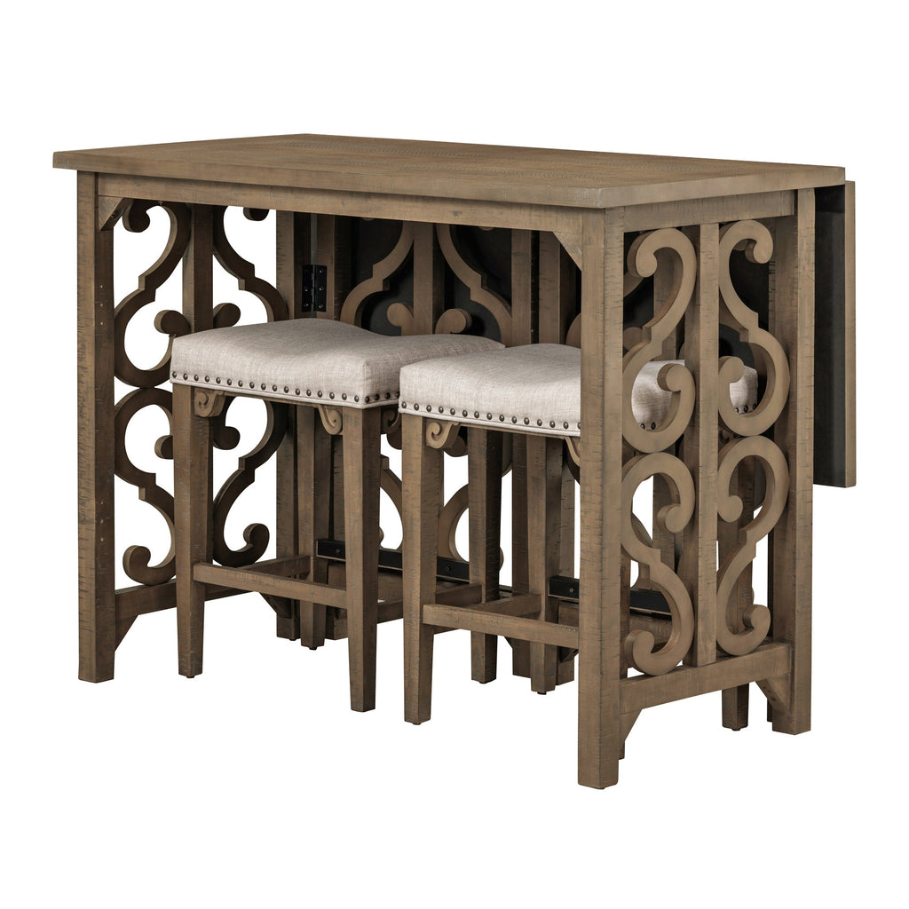- The retro 3-piece counter height dining table set consists of a folding dining table and two saddle stools. The style of this kitchen table set is belong to rustic style or industrial home style, which can be applied in various situations and can accommodate 2 people, kitchen, dining room, restaurant, coffee shop, featuring a perfect decoration in domestic use.