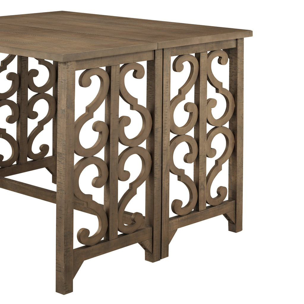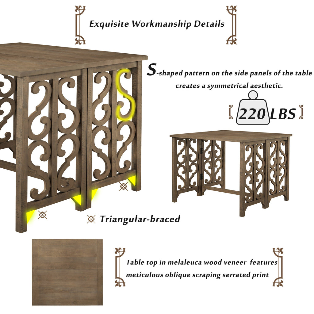 - The delicate S-shaped pattern on the side panels of the table creates a symmetrical aesthetic. Copper nails and iron stool foot bars add an industrial touch. Table top in pine solid wood veneer features meticulous oblique scraping serrated print, and solid wood legs make this set more stable. The triangular-braced wooden reinforcement structure at the bottom of the table provides sufficient load-bearing: 220LBS, the load-bearing of stool is 330LBS