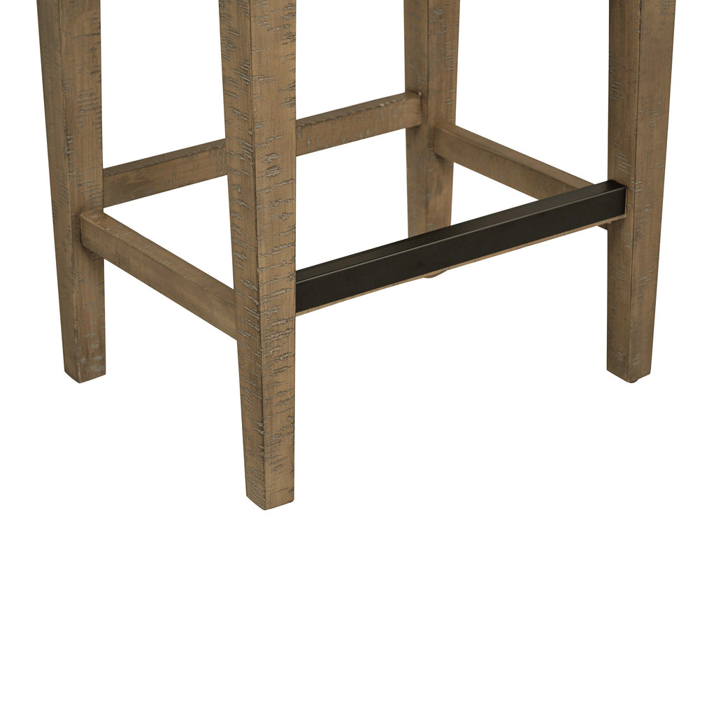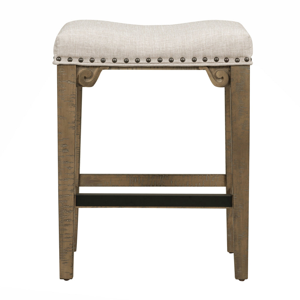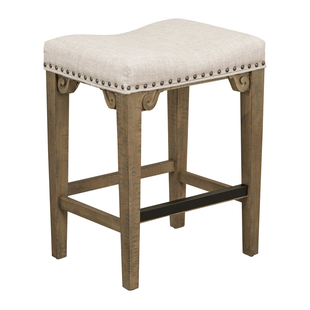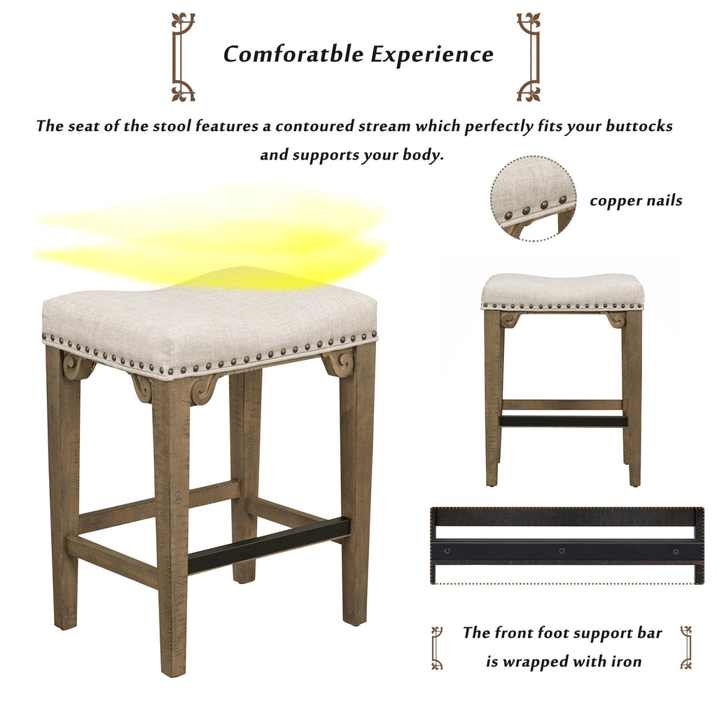 - The seat of the stool features a contoured stream which perfectly fits your buttocks and supports your body. The copper nails around the edge of the soft linen seat and unique curved molding under the seat add a touch of elegant to this simple stool. In addition, the foot support bar on the front side of the stool is wrapped with iron, which is more firm and easy to distinguish the placement of the stool. All chair legs have plastic pads at the bottom to prevent scratching the floor.