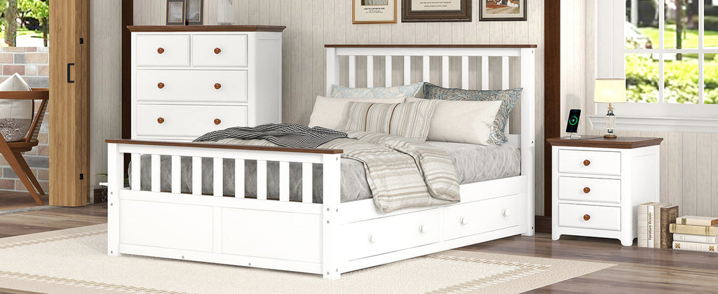3-Pieces Bedroom Sets Full Size Platform Bed with Nightstand(USB Charging Ports) and Storage Chest,White+Walnut