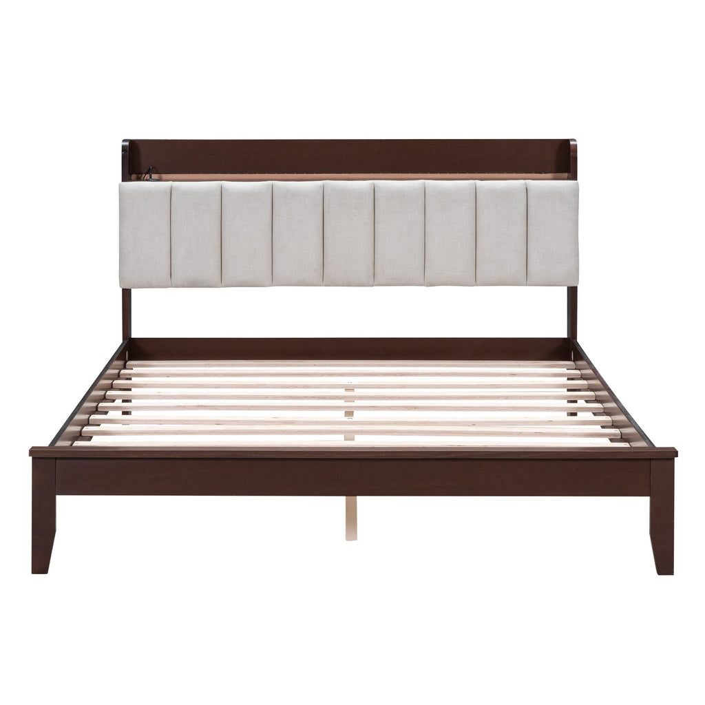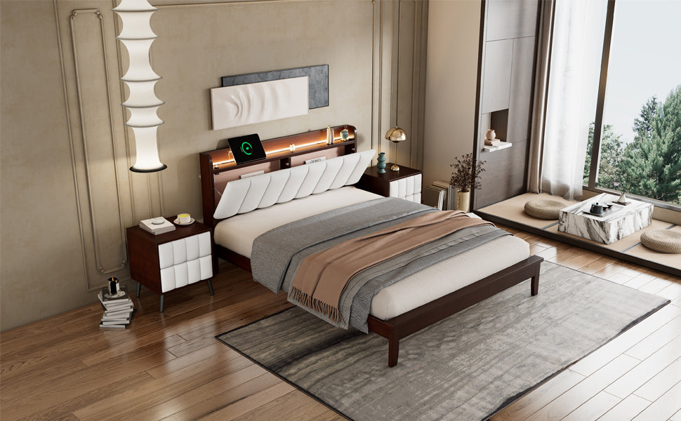 3-Pieces Bedroom Sets,Queen Size Wood Platform Bed and Two Nightstands,Storage Platform bed with USB and LED Lights-Walnut+Beige