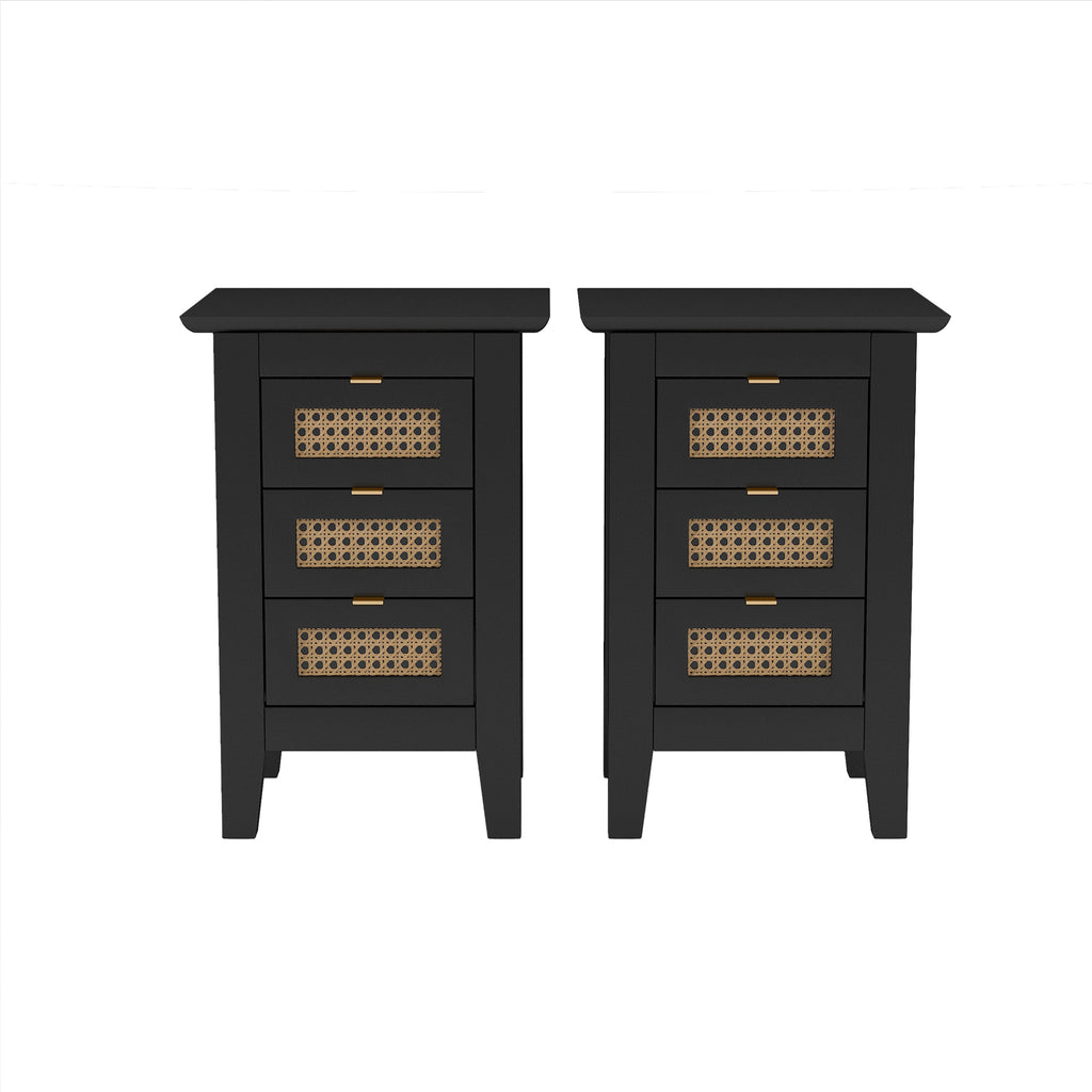3-Pieces Bedroom Sets Queen Size Wooden Platform Bed with Natural Rattan Headboard, Nightstands Set of 2 with Rattan-Woven Surfaces and Three Drawers for Bedroom, Black