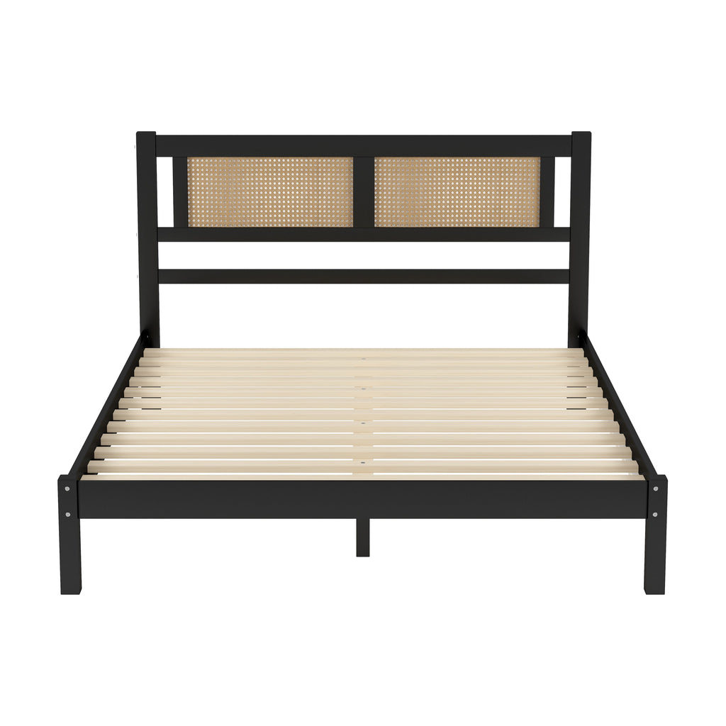 3-Pieces Bedroom Sets Queen Size Wooden Platform Bed with Natural Rattan Headboard and Nightstands