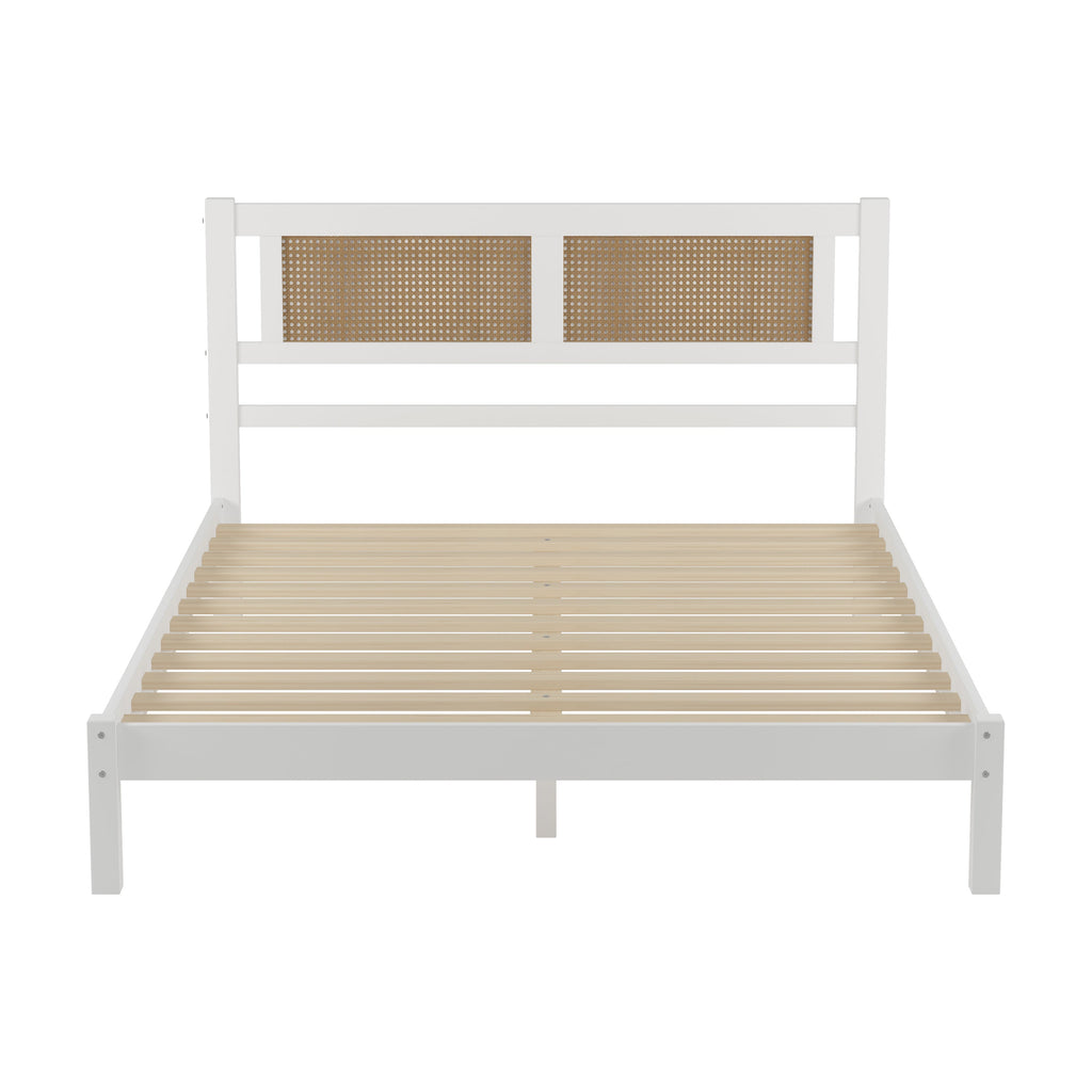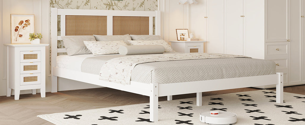 3-Pieces Bedroom Sets Queen Size Wooden Platform Bed with Natural Rattan Headboard and Nightstands