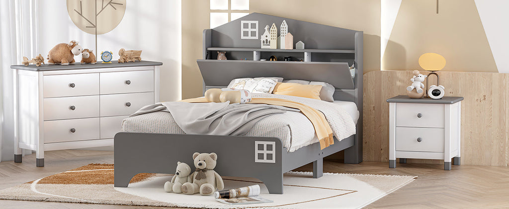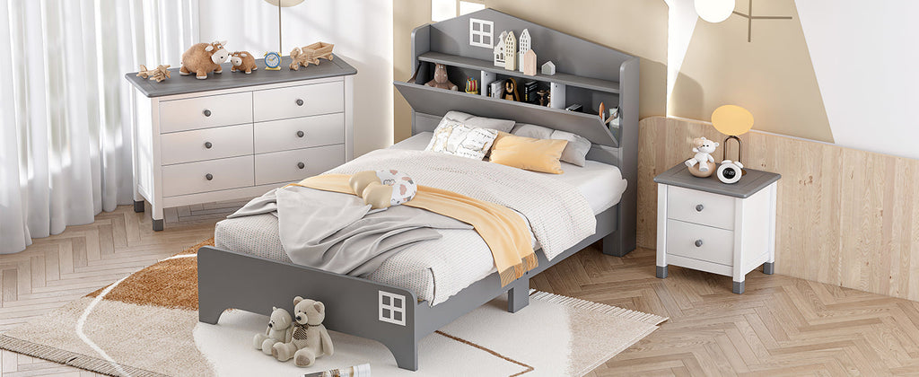 3-Pieces Bedroom Sets Twin Size House Bed with Storage Headboard, Wooden Nightstand and Storage Dresser,Gray