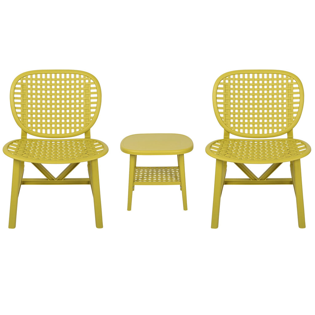 This table set includes two chairs and a matching end table with an open shelf, perfect for 2 persons to enjoy a cozy chat or a cup of coffee. Made of eco-friendly PP material, it is water and moisture-proof, solid, durable and easy to clean. Chairs with curved backrest, curved surface and cross bars offer you comfortable and stable sitting experience. Retro and simple appearance blend well with your garden, yard, balcony, etc.