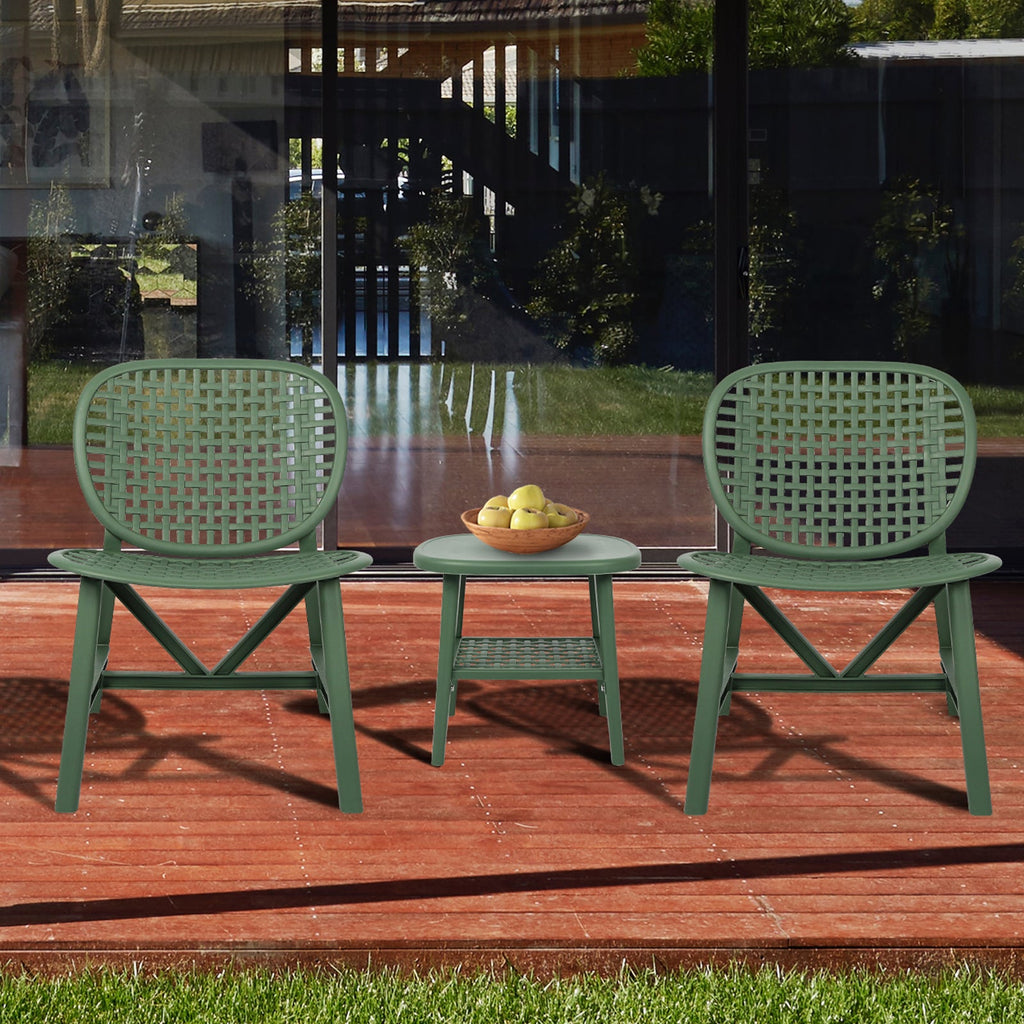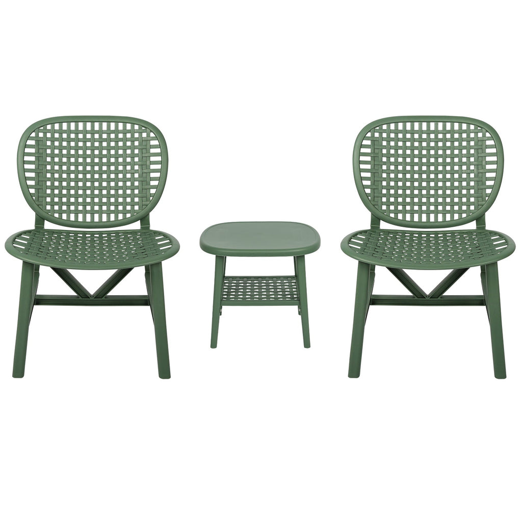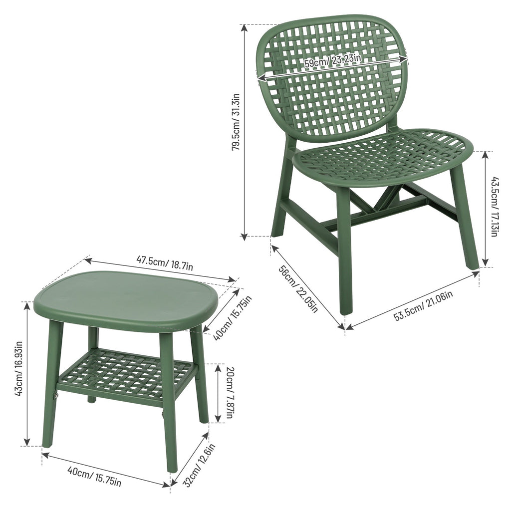 Description:This table set includes two chairs and a matching end table with an open shelf, perfect for 2 persons to enjoy a cozy chat or a cup of coffee. Made of eco-friendly PP material, it is water and moisture-proof, solid, durable and easy to clean. Chairs with curved backrest, curved surface and cross bars offer you comfortable and stable sitting experience. Retro and simple appearance blend well with your garden, yard, balcony, etc.