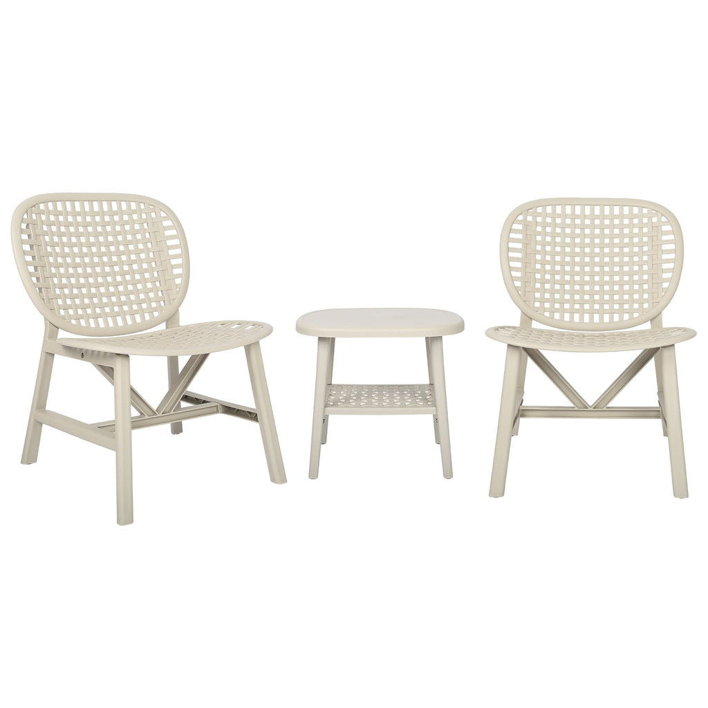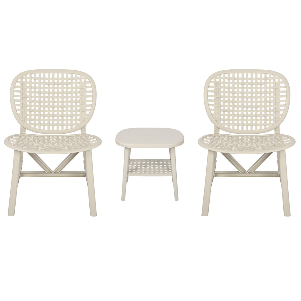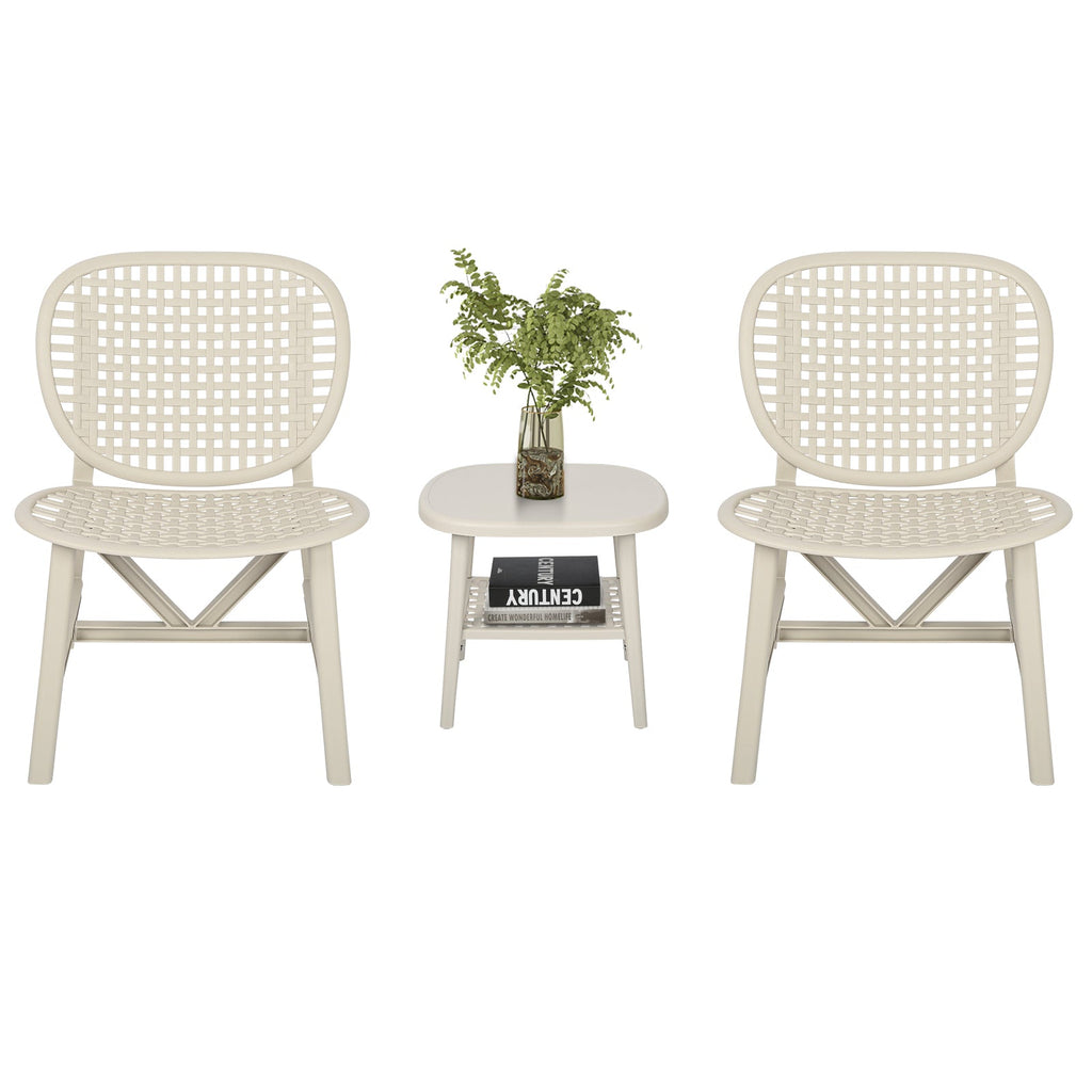 Description:This table set includes two chairs and a matching end table with an open shelf, perfect for 2 persons to enjoy a cozy chat or a cup of coffee. Made of eco-friendly PP material, it is water and moisture-proof, solid, durable and easy to clean. Chairs with curved backrest, curved surface and cross bars offer you comfortable and stable sitting experience. Retro and simple appearance blend well with your garden, yard, balcony, etc.