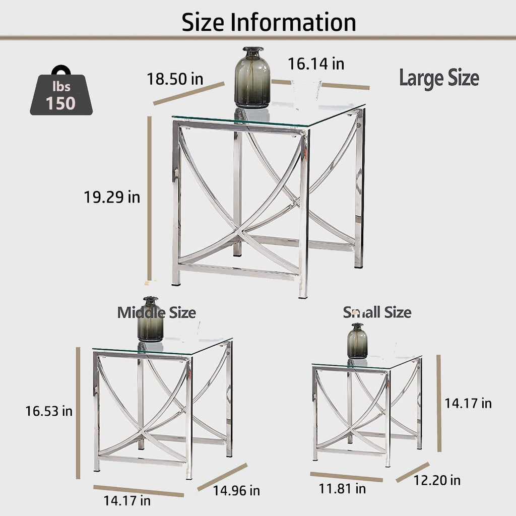 3 Pieces Silver Square Nesting Glass End Tables- Small Coffee Table Set- Stainless Steel Small Coffee Tables with Dark Gray Tempered Glass- 18" Modern Minimalist Side Table for Living Room (Curve)