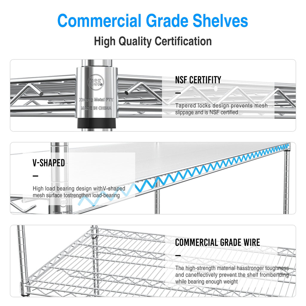• STURDY & EXTREMELY DURABLE - Wire shelving made of heavy steel, it has excellent rust resistance and oxidation resistance. Our wire shelf liner is crafted to provide unparalleled quality, longevity, function and beauty. Better quality thicker than the competition. The 3 tier shelf unit passed NSF certified, safe and reliable. Storage rack are perfect addition to home, office, garage, kitchen, commercial premises.