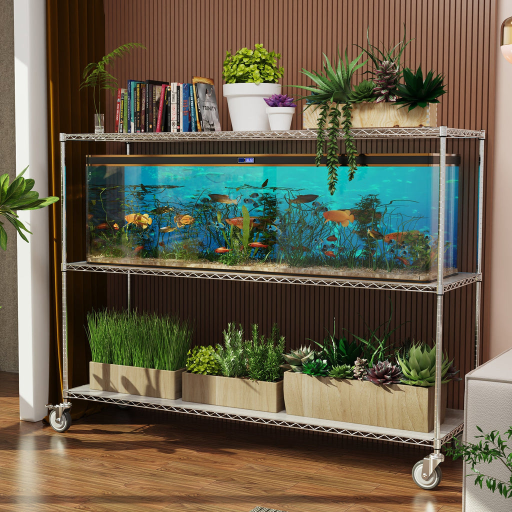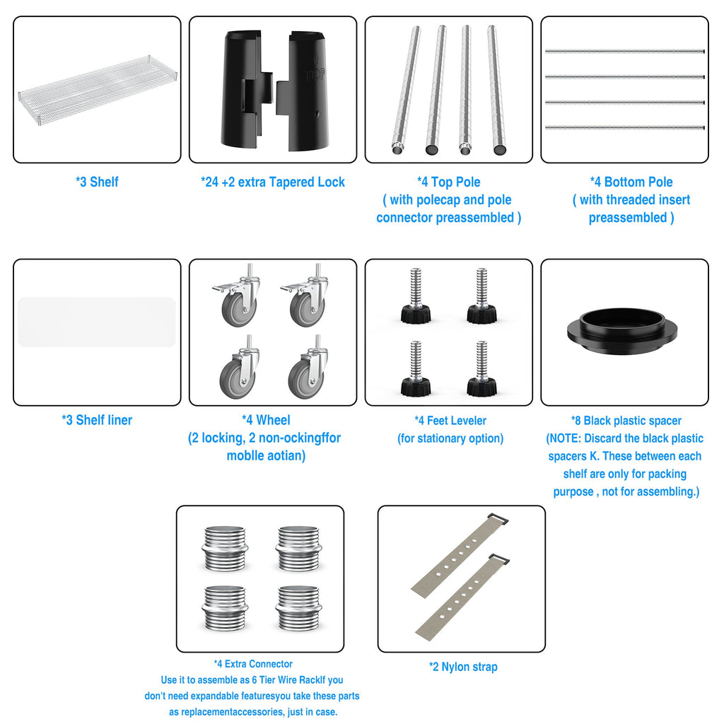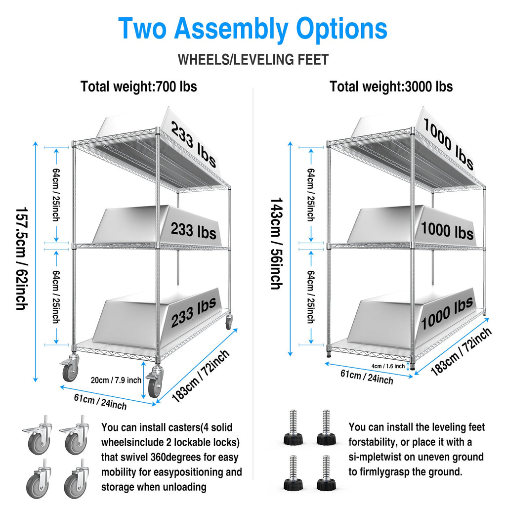 3 TIER LARGE CAPACITY - Heavy duty shelving with leveling feet - each layer shelf can hold 1000lbs (evenly distributed), maximum load capacity is 3000 lbs. It is recommend that heavy items on the bottom shelf for maximum stability. 3 shelf Liners choice of beautiful and fun transparent colors allow you to add a pop of color to your life. Shelf liners is waterproof - Won't get damaged from exposure to moisture. STURDY & EXTREMELY DURABLE - Wire shelving made of heavy steel, it has excellent rust resistance and oxidation resistance. Our wire shelf liner is crafted to provide unparalleled quality, longevity, function and beauty. Better quality thicker than the competition. The 3 tier shelf unit passed NSF certified, safe and reliable. Storage rack are perfect addition to home, office, garage, kitchen, commercial premises. ADJUSTABLE & DIY DESIG - Each shelf can adjustable in 1-inch increments, adjust the shelf height according to size of the item, meet your different needs, get the best utility shelf. At the top of the upper pipe, there's a reserved screw interface for seamless continuation of assembly. This means that if a customer purchases two sets of the product, they can effortlessly extend its functionality upwards. EASY MOVEMENT - The 3 tier shelves have 4 leveling feet, 4 5-inch industrial wheels(2 lockable). Wire rack on wheels can be easily positioned in supermarkets, garages, closets, kitchens, porch, pantry, etc. Height-adjustable leveling feet can be placed on uneven ground- simply twist to stabilize. Non-slip, will not scratch ground. EASY TO ASSEMBLE - With detailed instructions and no tools required, you can install it easily with another person within 15 minutes. There are many parts in the package, please feel free to contact us via buyer message if meet the case of missing parts and assembly.