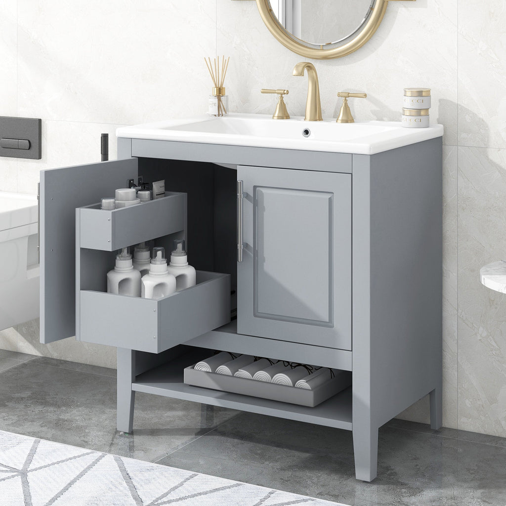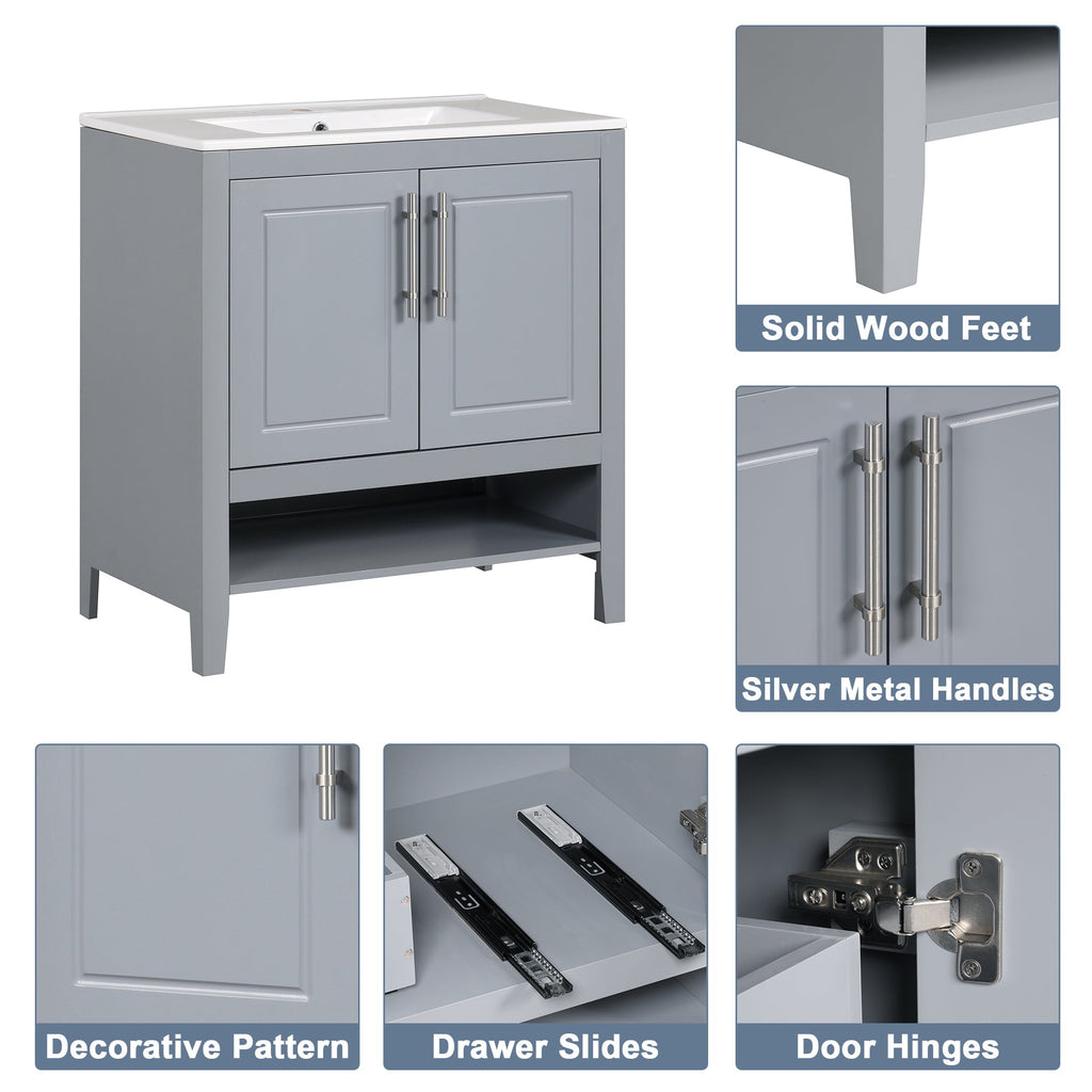 30" Bathroom Vanity with Sink, Multi-functional Bathroom Cabinet with Doors and Drawers, Solid Frame and MDF Board, Grey