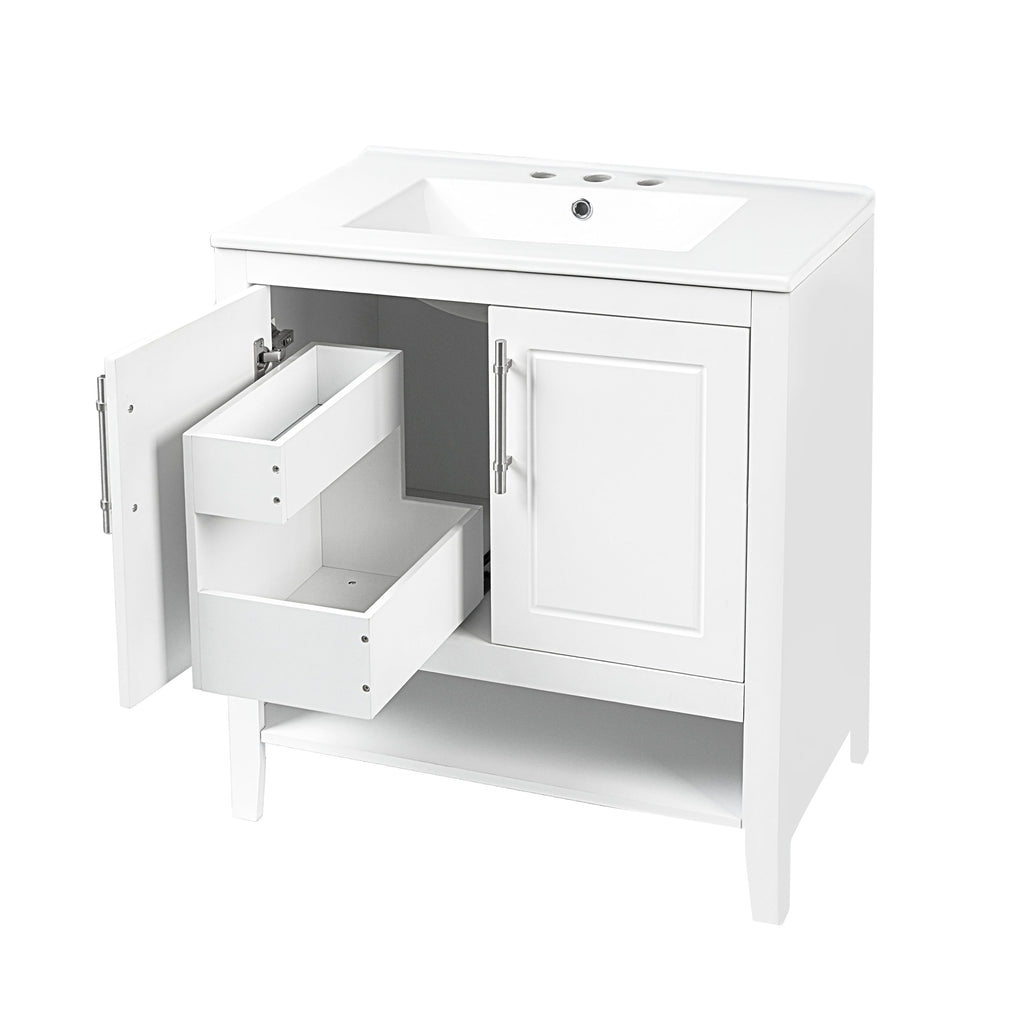 - Stylish Bathroom Vanity: This bathroom vanity is suitable for bathroom in any decoration style. Freestanding white vanity cabinet with silver handles complies with your bathroom facilities. The groove design on the door increases the artistry and aesthetics of home. If you're looking for a simple but stylish bathroom sink vanity, our product will be a great choice to upgrade your bathroom.