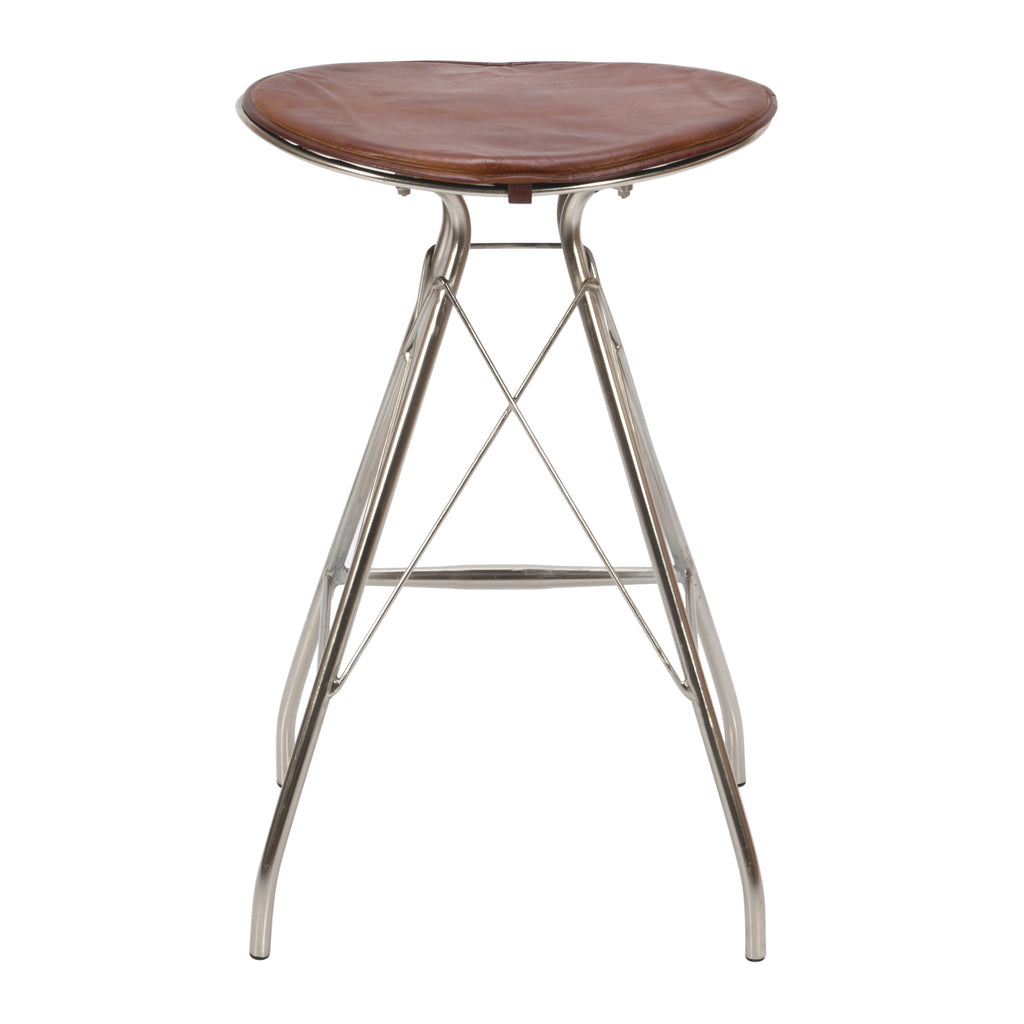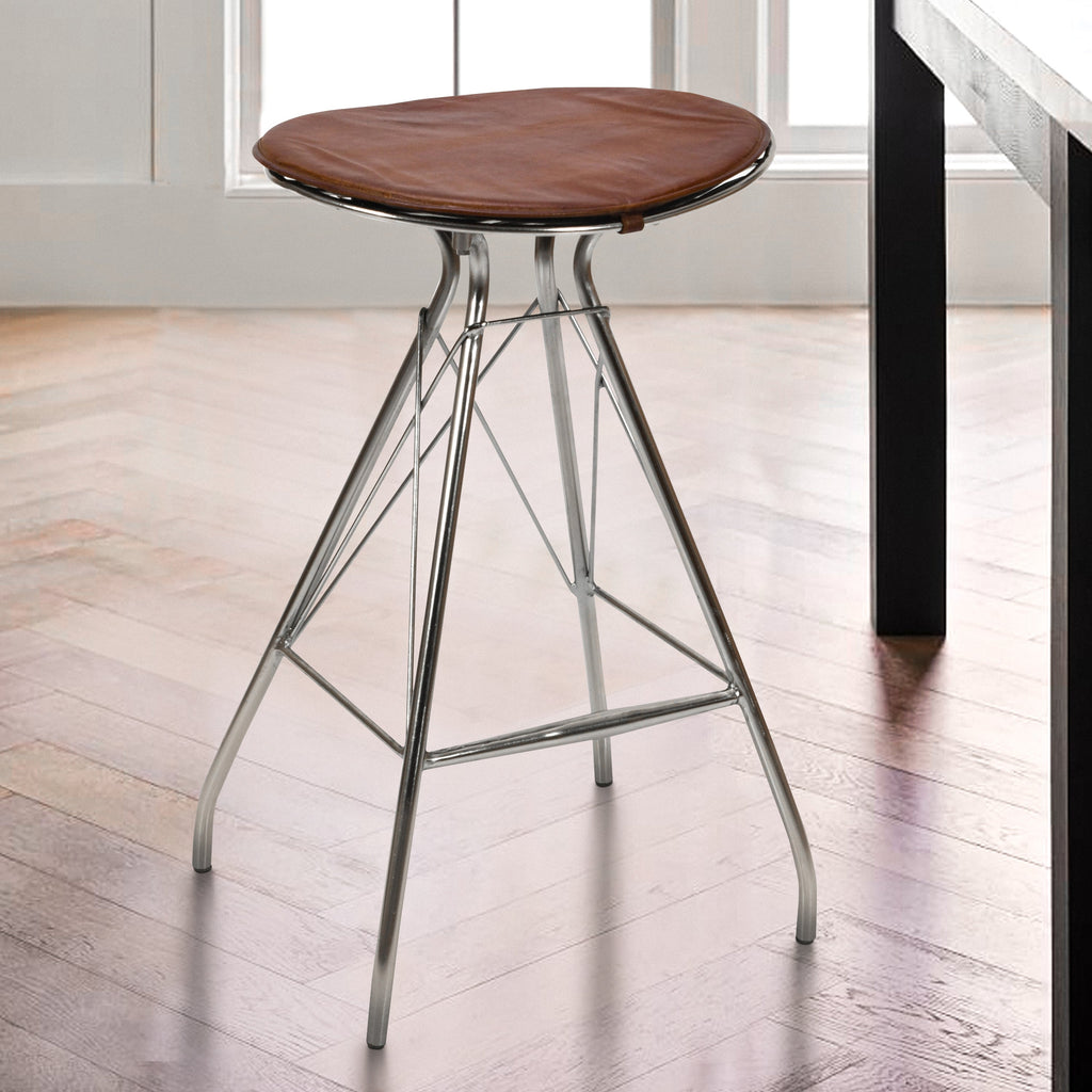 Expert craftsmanship meets contemporary glamour with this handcrafted, artisanally designed barstool. Featuring a curved round padded seat, this barstool makes a perfect fit for your bar table or bar height countertop. Fully built from a lightweight yet sturdy iron frame in nickel silver finish, the seat is gorgeously upholstered in dark brown genuine leather. Additionally, the flared design frame complement the X shaped bar accents for a simple yet appealing aesthetic, sure to add a unique character to your home bar, kitchen, lounge, or dining area. Clean lined and simply stylish, the piece goes perfectly well with a wide variety of decor, whether it is industrial, transitional, modern or Scandinavian.