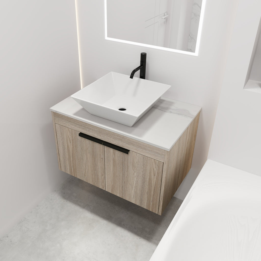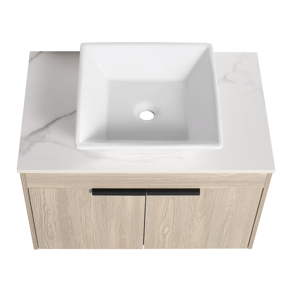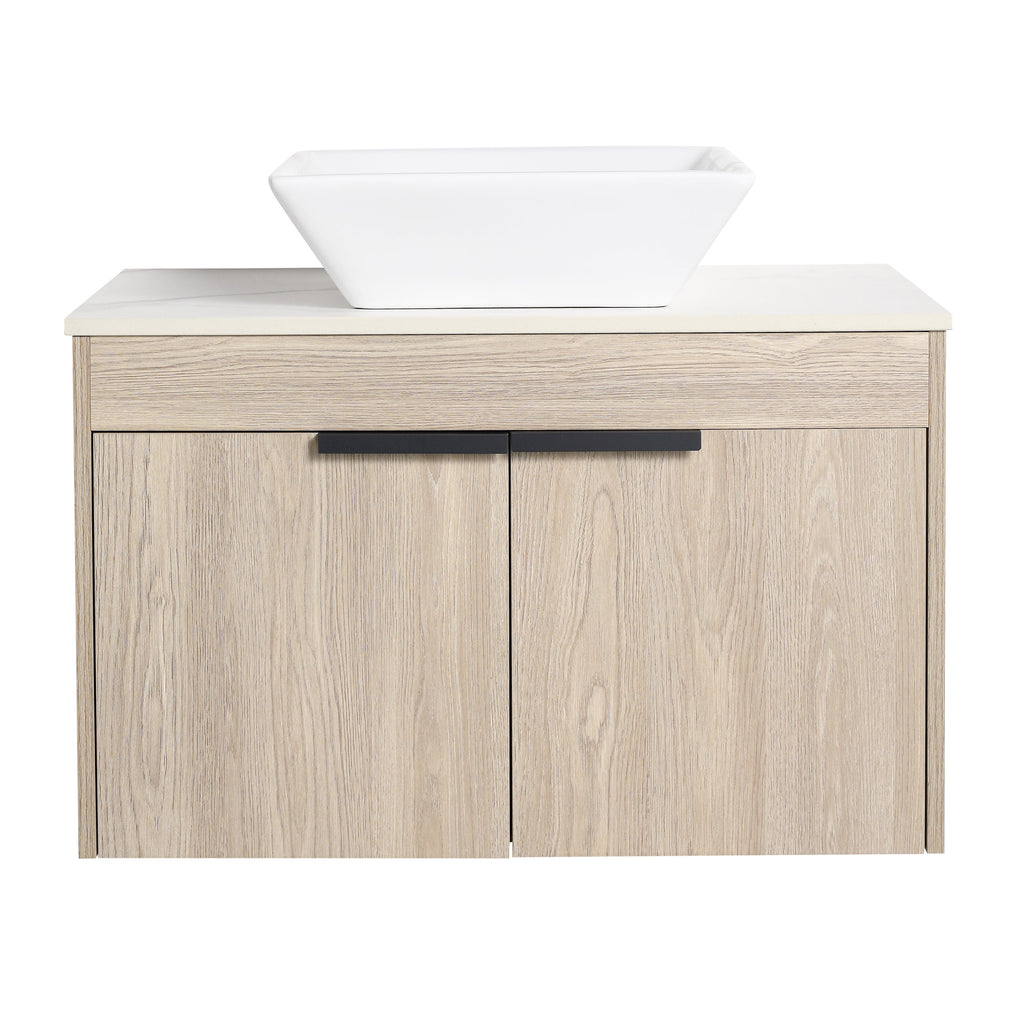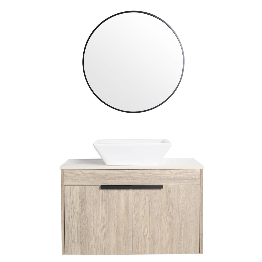 Simple double layer 30-inch white bathroom cabinet Construction: Plywood Assembly required: Included Assembling Accessories & Instructions. Not included Mirror, Faucet and Pop-up Drain Cabinet color: White Oak (Note: this vessel sink is single hole) Vanity Size: 29.5"W x 18.9"Dx 18.3"H Ceramic Sink Size:16.3"Wx16.3"Dx5.0"H. The bathroom vanity set has 2 Door Handles are High-quality Metal finished.Durable and strong.
