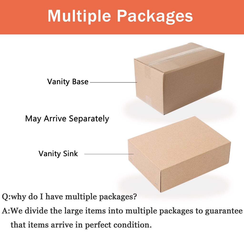Packages:The vanity and ceramic sink are shipped in two separate packages.(Probably will be delivered at different time,please notice and hope to get your understanding,thx)Not included mirror,faucet and pop-up drain.