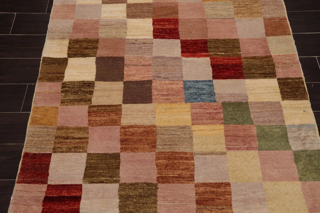 This is a beautiful Beige, Gold, Gray, Rust, Taupe, Green, Aqua, Multi Hand Knotted wool rug from Pakistan. The wool not only adds to rug's durability, but also provides dirt repelling quality and thermal insulation. The rug features a modern Checkerboard design that carries a graphic tone and designer look. It is primed to add visual glamor and class to its surroundings. Its soft texture and timeless design make it ideal to enhance any space where it is placed.