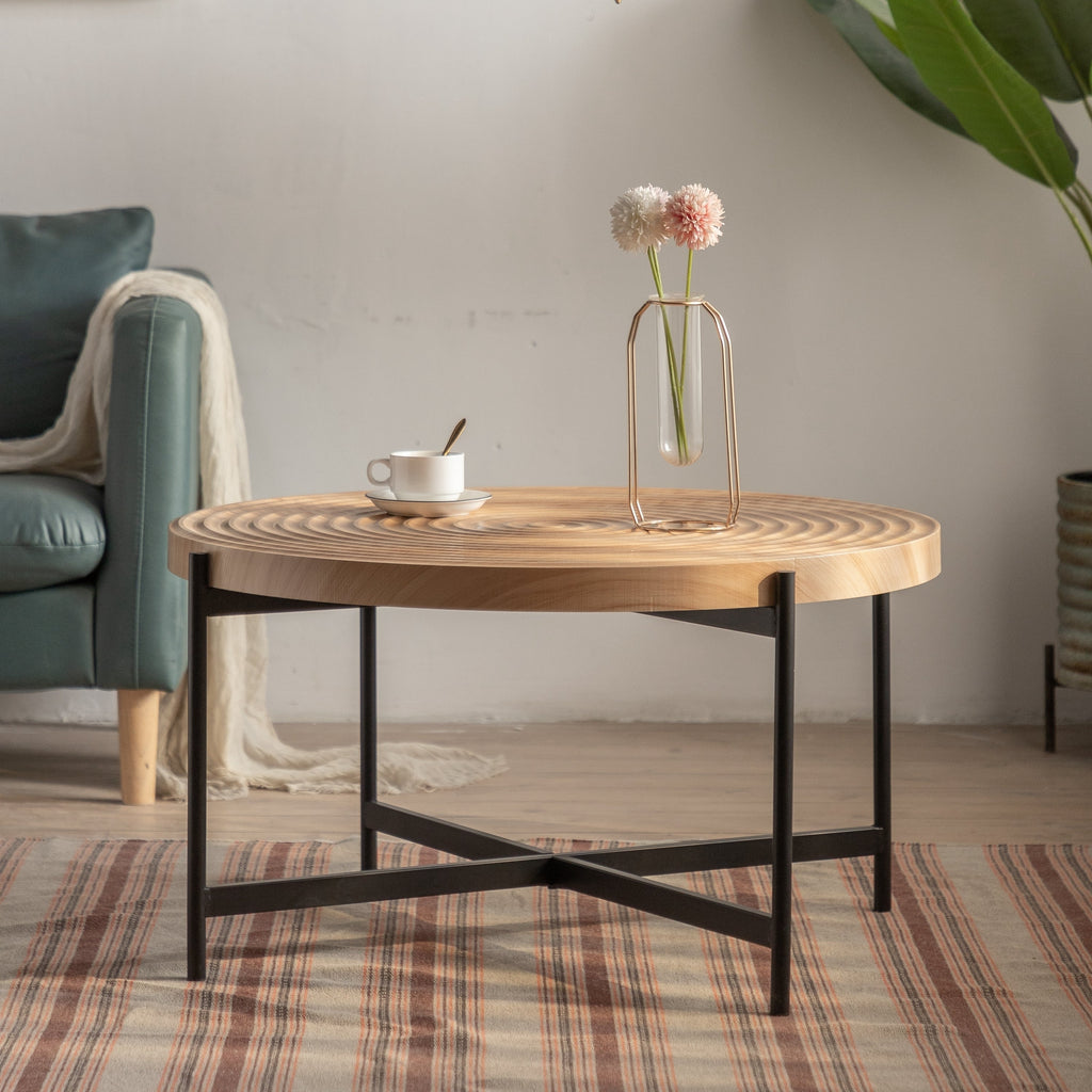 This round coffee table to easily display decorative centerpieces plus storing magazines, beverages, or snacks while entertaining in the living room.A functional table can be used for relaxing teatime and coffee hours with family or friends. Extra room under the table can provide you flexibility of using your space. Features: 1).High Quality Material:This round coffee table uses a combination of high quality MDF top and high quality metal iron,Round coffee table with strong metal frame and the table top is high-grade MDF board, durable and solid,cross legs provide stability. 2).Modern Design:The modern coffee table with KD thread design is beautiful and durable. 3).Reasonable Load-bearing Capacity: In order to meet a variety of requirements in your daily life, the load-bearing capacity setting of this dining table is reasonable and practical.The load-bearing capacity of the tabletop is 220 lbs. 4).Easy to assemble and maintain:The simple design makes assembly very easy, all hardware and detailed instructions are provided, and the workbench is easy to complete. The smooth surface is easy to clean and can help you save a lot of time and effort.