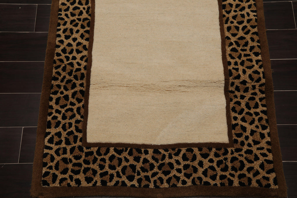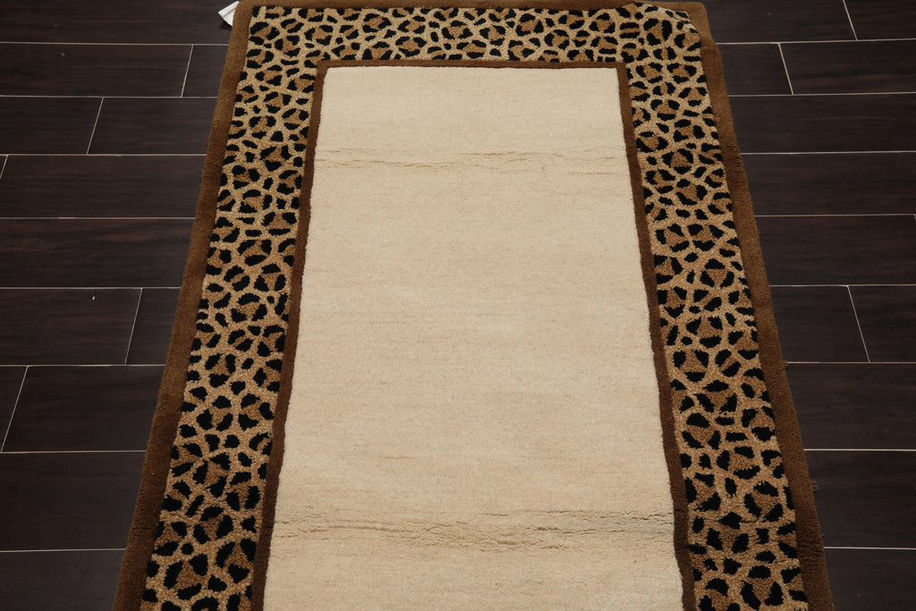 This is a beautiful Ivory, Brown, Tan, Black Color Cheetah Print Border Hand Tufted Persian Oriental Area Rug Wool Rug. Its elegant style is easy to decorate with and perfect for living room, dining room, bed room or anywhere in the residence or office.