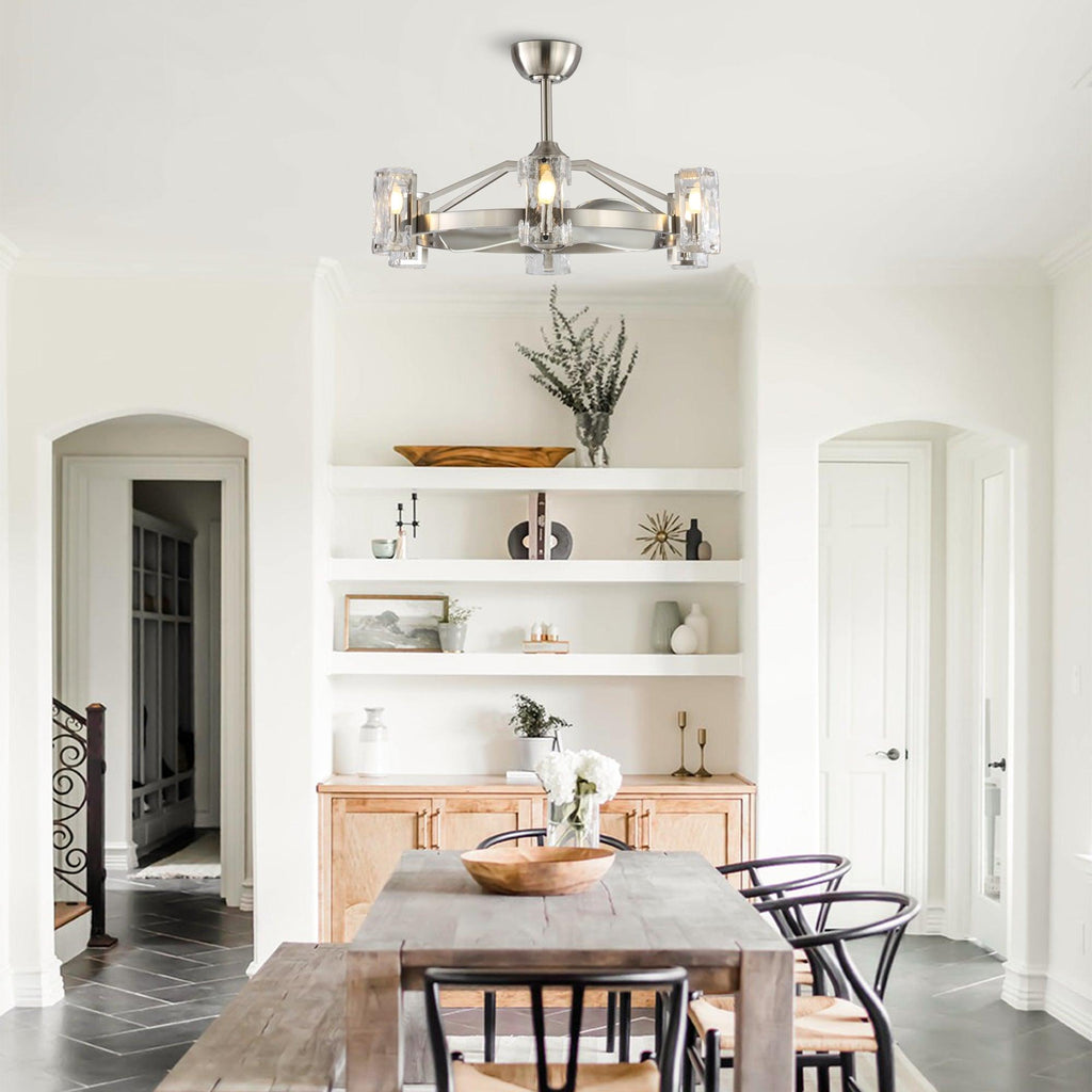 This decorative and functional chandelier ceiling fan Fandelier 3 blades ceiling fan with a light and remote. Reversible blades. 6 fan speed gives off a great airflow, required 6-piece 4-Watt light bulbs. The timing function, allows you are able to choose the working time. With its delicate hand-craft and glamorous appearance, this Satin Nickel 3 Blade Ceiling Fan with Remote is surely a statement piece for your kitchen, dining room, living room, bedroom, or foyer.