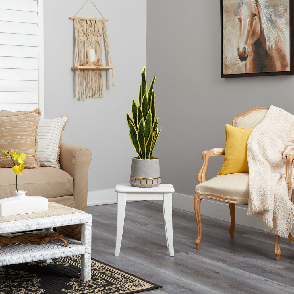 Hiss… Don’t be intimidated by this artificial Sansevieria plant. Filled with intricate detailing on the sword-like, thick leaves, this realistic faux Sansevieria brings vertical appeal to any space with the yellowish hued tips. While eliminating the fear of overwatering, this fake plant looks fresh year-round. Standing 34", from a stoneware planter with gold trimmings (included in height) nestled with faux moss curate in compact spaces. Perfect for an apartment, lonely corner or office.