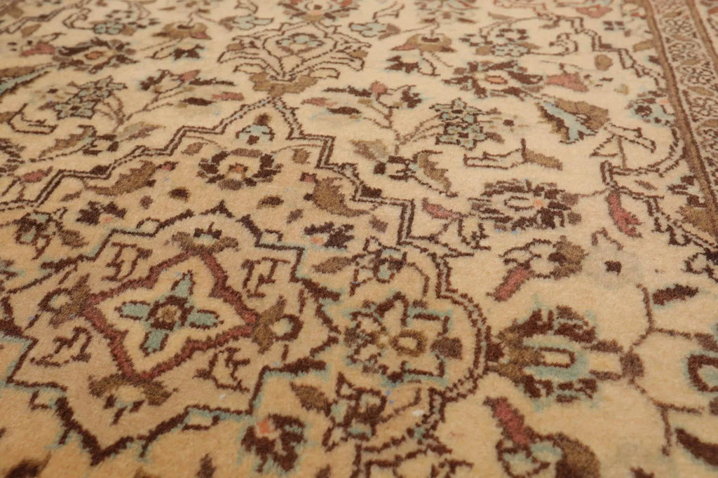 Story Behind the Art Like many other Persian rugs, Kashan rugs draw their name from the city of their origins, Kashan in Iran. Known for their tight weave and superior craftsmanship, Kashan rugs feature arabesques and flower-stems, palmettos, rosettes, blossom and leaf motifs in very dense patterns of endless or centralized repeats of floral ornamentation. A central medallion with pendant systems enhanced by corner spandrels and repeating floral motifs completes the design. During the 16th century, master weavers and dyers were brought to the area of modern-day Pakistan and India to begin producing very high-quality Kashan design rugs even surpassing some produced in Persia