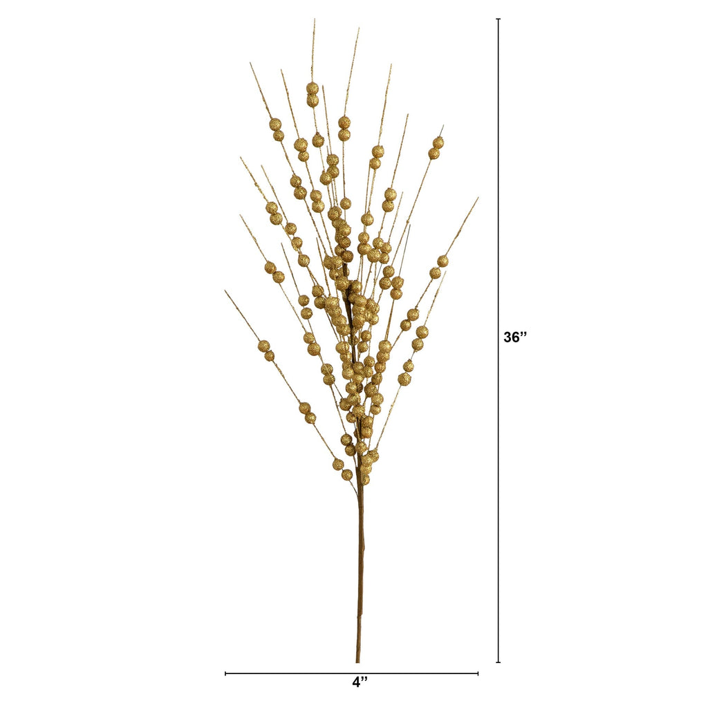 Stay in a golden state of mind this holiday season with the artificial berry stem in a gold finish. Perfect for holiday entertaining and inspired by the festive spirit, faux golden berries dangle from twig-like branches, adding a realistic charm. Christmas should be fun, and these faux stems boast a personality that transcends the season, making them ideal for year-round display. Feel free to DIY: trim, shape, or bend the wired branches to suit your style. At 36in from tip to base, this set will look berry excellent in any vase. Ideal for displaying in dining room for the season & beyond. Ideal for displaying in dining room for the season.
