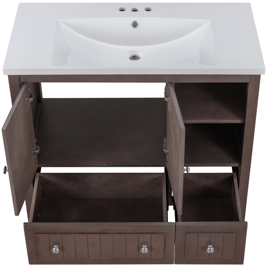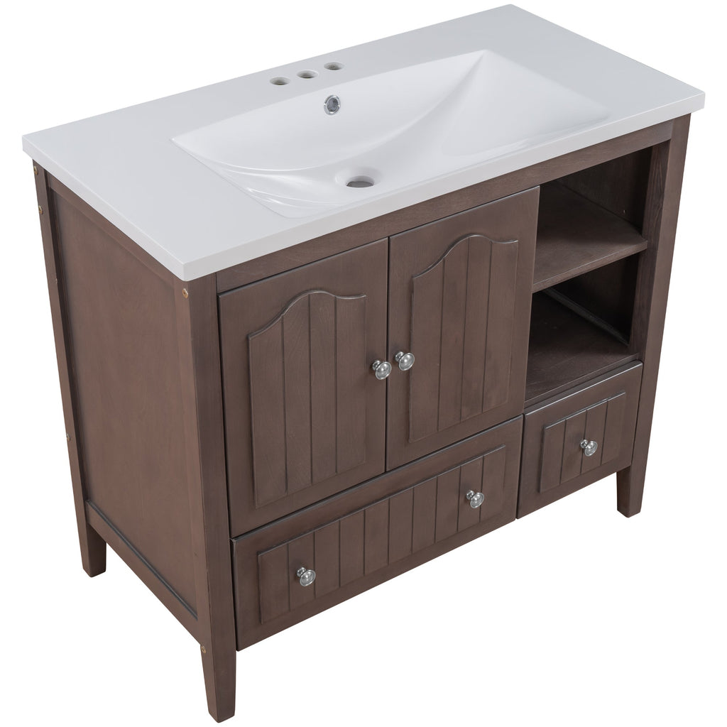 36" Bathroom Vanity with Ceramic Basin, Bathroom Storage Cabinet with Two Doors and Drawers, Solid Frame, Metal Handles, Brown