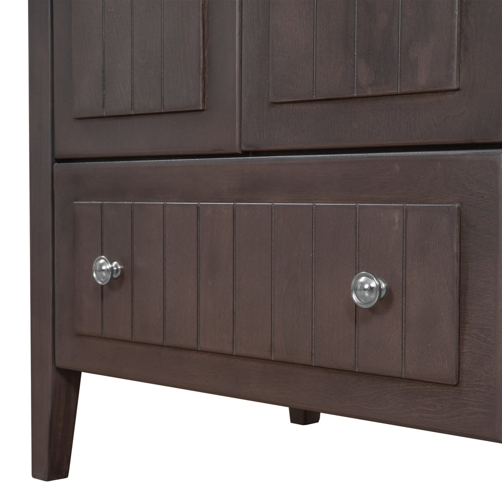 A bathroom vanity is a crucial furniture in every bathroom. With raised groove pattern effect decorations on doors and front boards of drawers, this product meets the needs of daily life and represents high artistic grade. In a humid environment like the bathroom, a furniture needs to take into account the storage requirements of different items. In that case, different functional zones are particularly important. Two drawers in different size offer more options for storing a lot of daily sundries. And these metal round handles ensure the comfort using experience. Users can choose the suitable storage space to place the right items. Wooden structure and MDF boards guarantee the stability and durability in long-term usage. Ceramic basin ensures the smooth touch experience and easy cleaning process, and there are necessary functional holes. This product also shows elegant and rigorous temperament, thus, it's very suitable for your different bathroom decoration style.