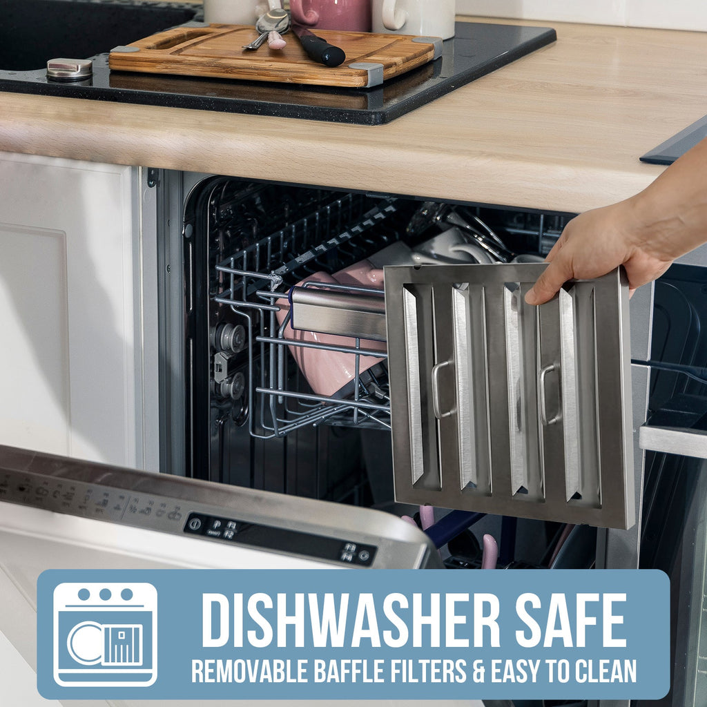 HASSLE-FREE CLEANING & SUPERIOR FILTRATION - The vent hood features dishwasher-safe and easily removable stainless steel baffle filters to make maintenance a breeze. The charcoal filters are effective in capturing cooking grease and oil.
