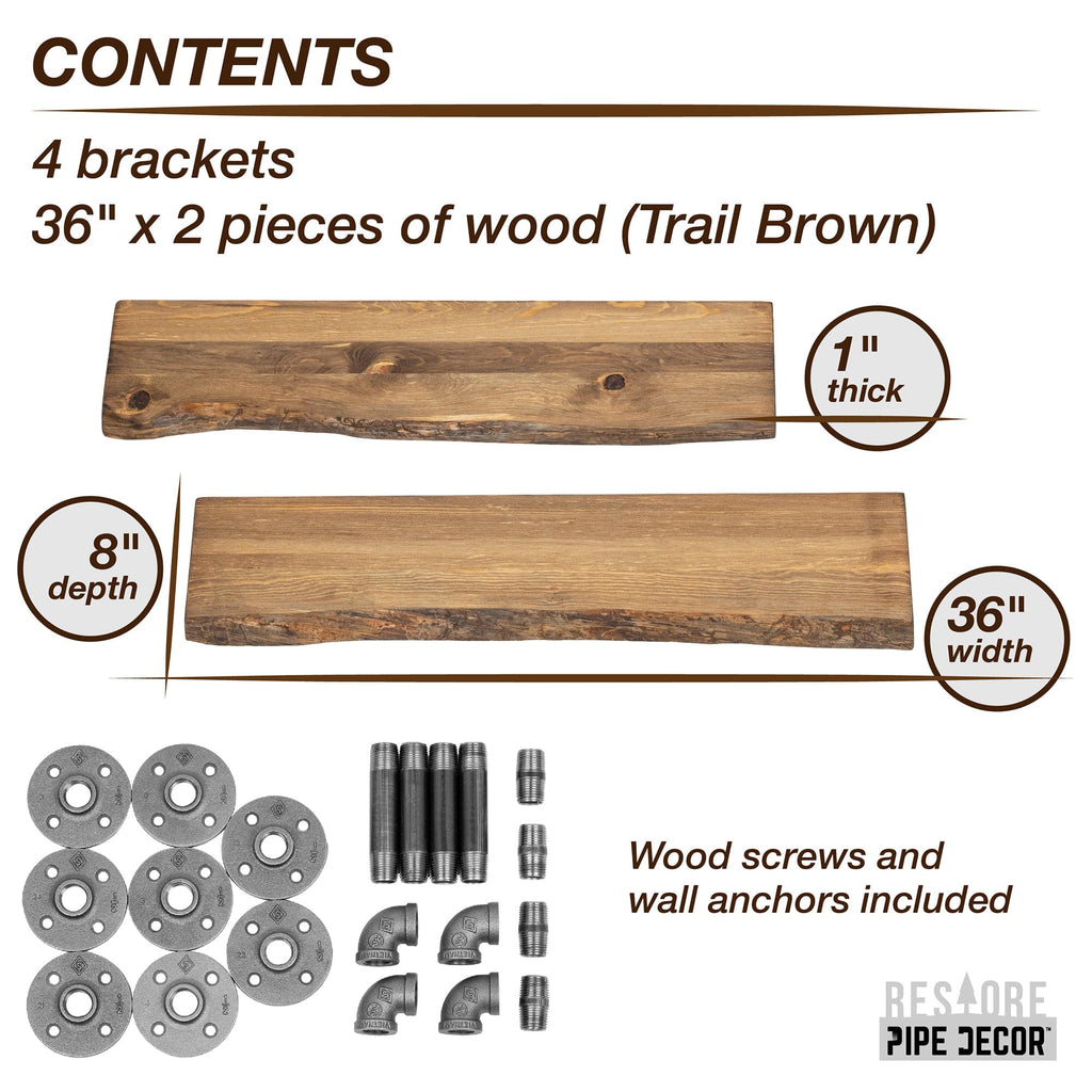 36” Trail Brown Live Edge Wood Shelf with L-Shaped Pipe Brackets (2-Pack)