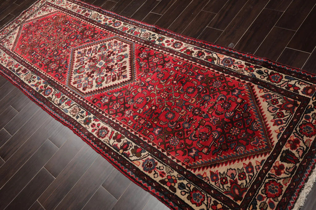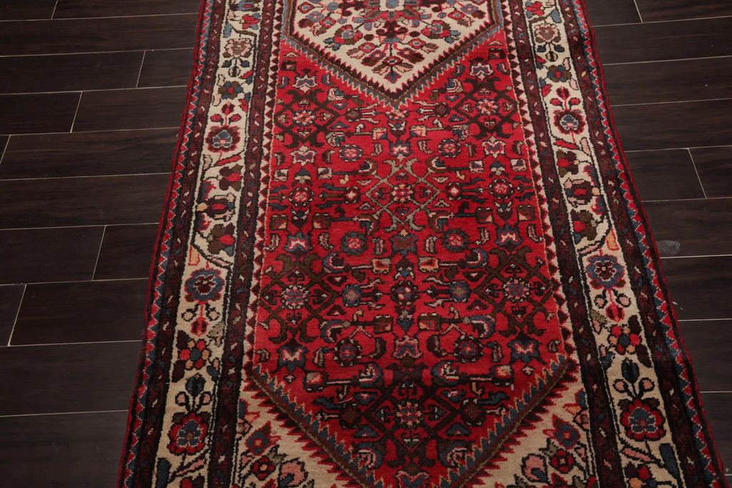 Before you is a gem from Persian rugs' vast repertoire of artisanal rugs, an authentic vintage Heriz runner rug. The rug represents the finest of rug traditions in the world and is a stunning composition of technique, craftsmanship and design. With a rich color palette, rug is a visual delight with a geometric medallion on an inner field decked with rectilinear floral motifs. The overall impression is one of uber sophistication, timeless beauty, and exquisite craftsmanship.