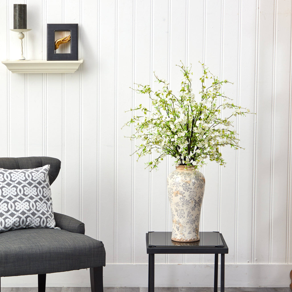Many wispy stems filled with delicate blooms fan out gracefully atop a decorative vase with this cherry blossom artificial arrangement. Bring this stunning piece inside your home to welcome in a spring vibe all year long. To complete the look, allow other faux flowering plants to be settled in tall vases and placed upon a few accent tables across any room to create a long-lasting, fresh and bright atmosphere.