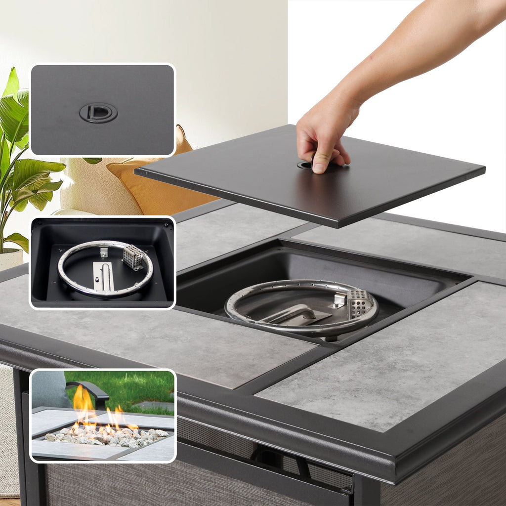 - Ignition system: Stainless steel control panel with pulse electronic ignition system easily ignites and adjusts. With a heat output of 46,000 BTU, this propane gas fire pit table provides excellent flame sparkle.