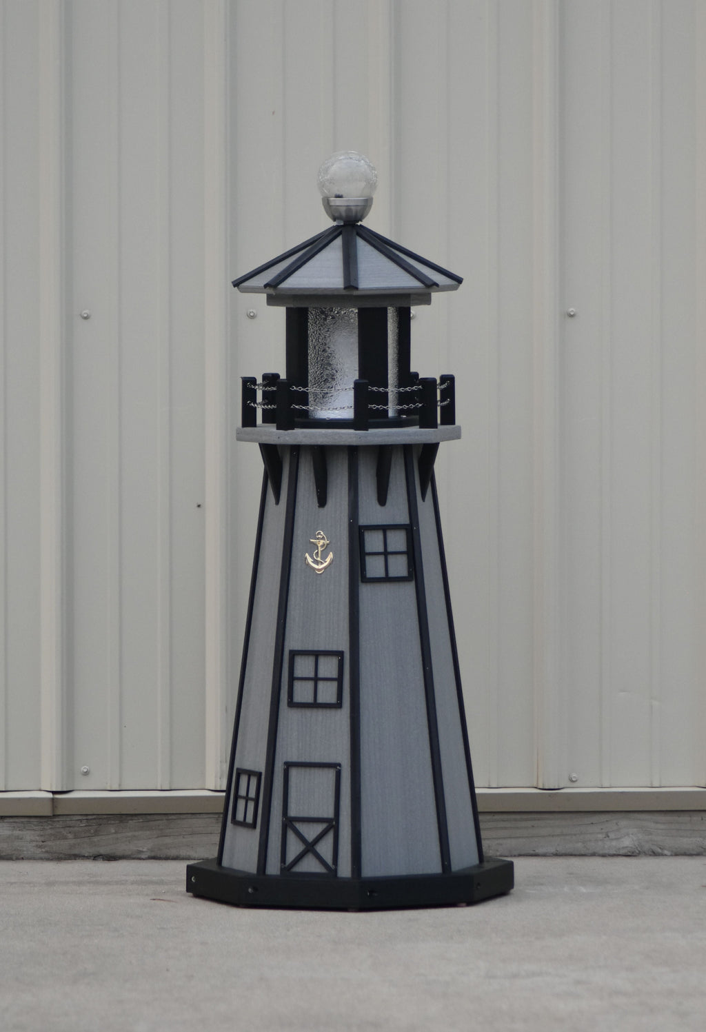 Pictured is a 39" Driftwood Gray lighthouse with black trim