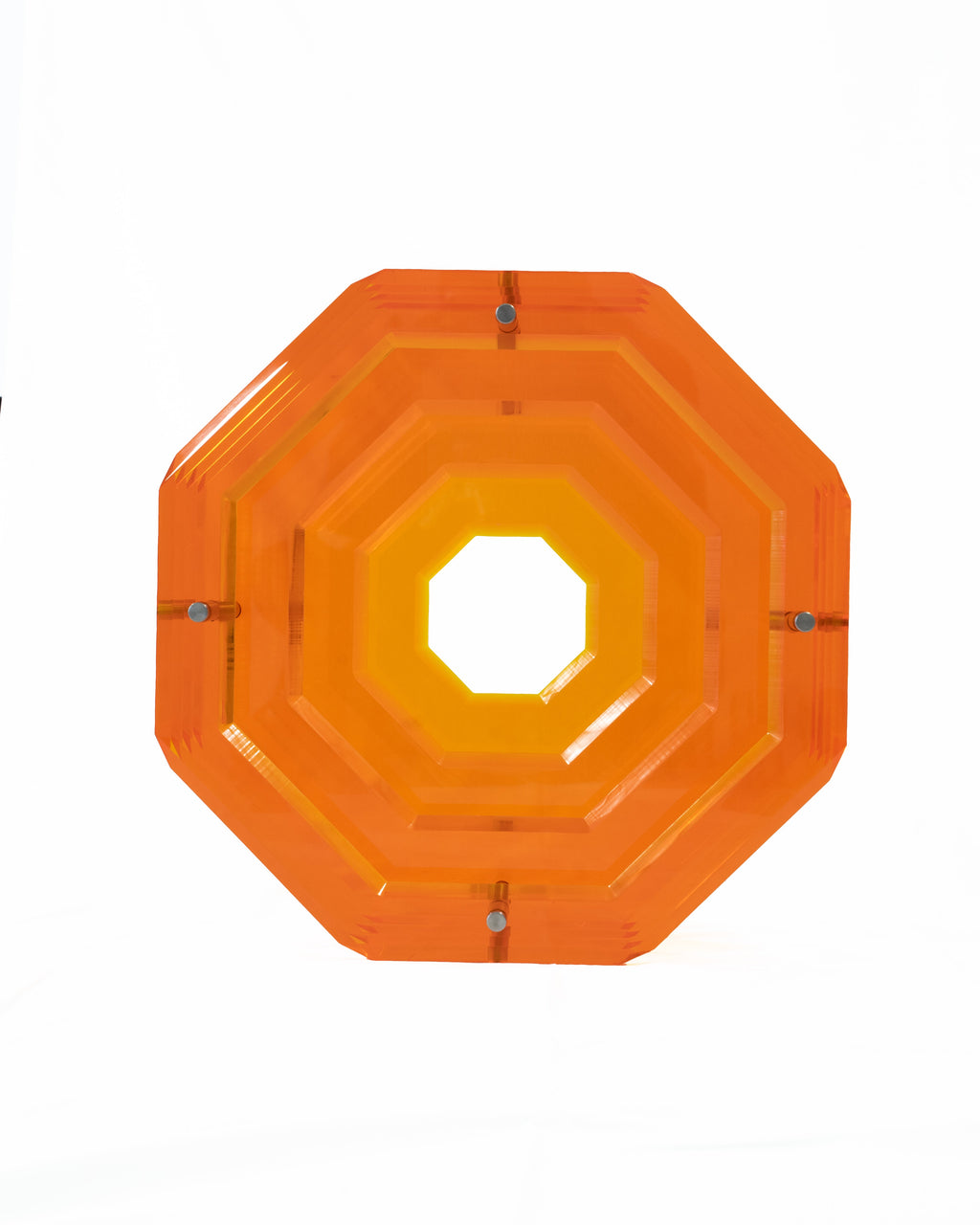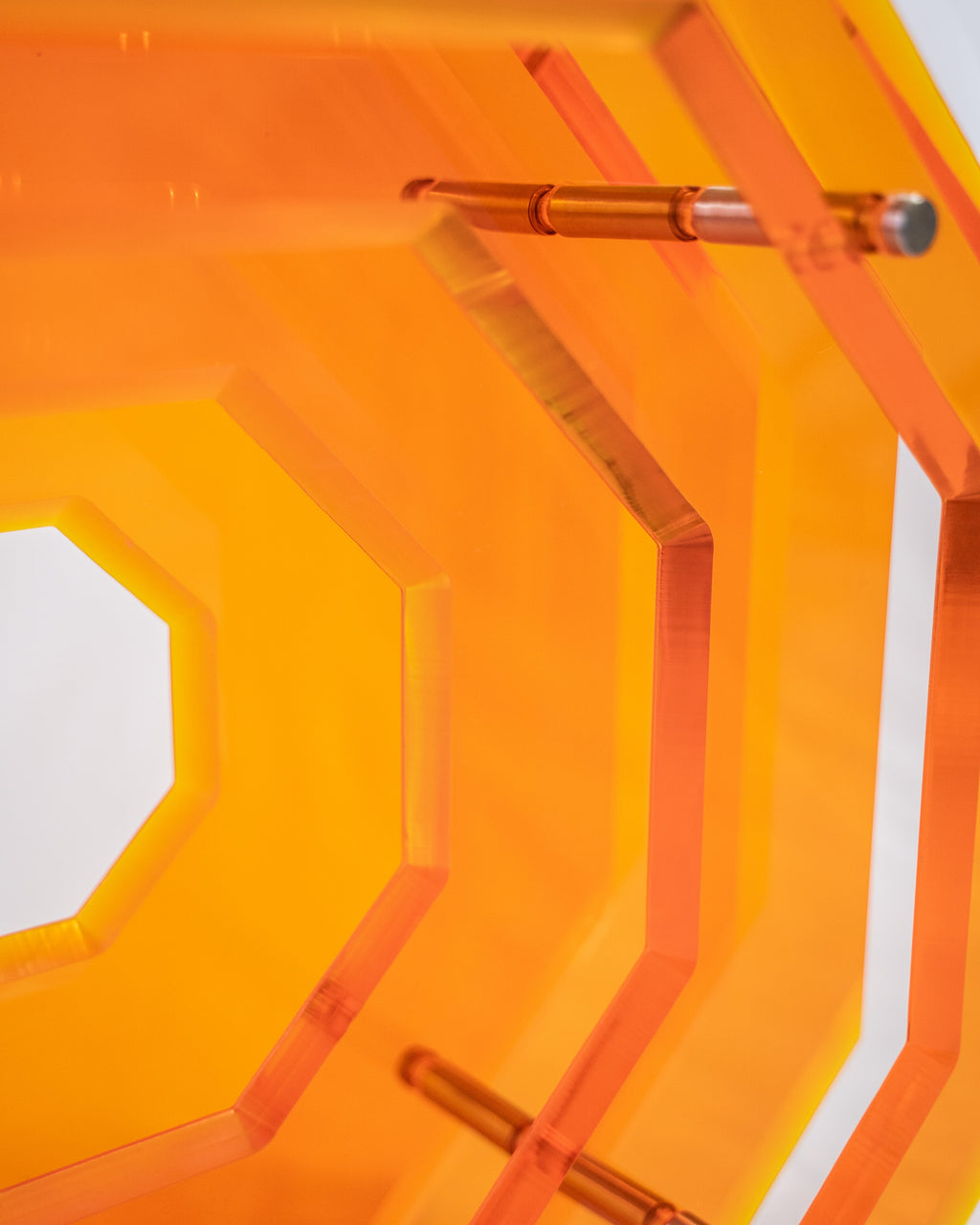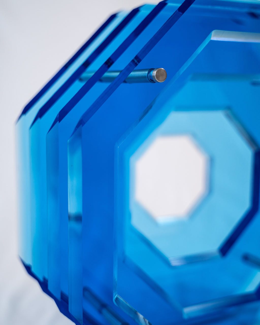This piece is on its own, is an entire house statement. Created from the design masters at Akrylico Designs, our sculpture comes to life layering thick laminates of acrylic perfectly polished and layered into a hexagon shape.