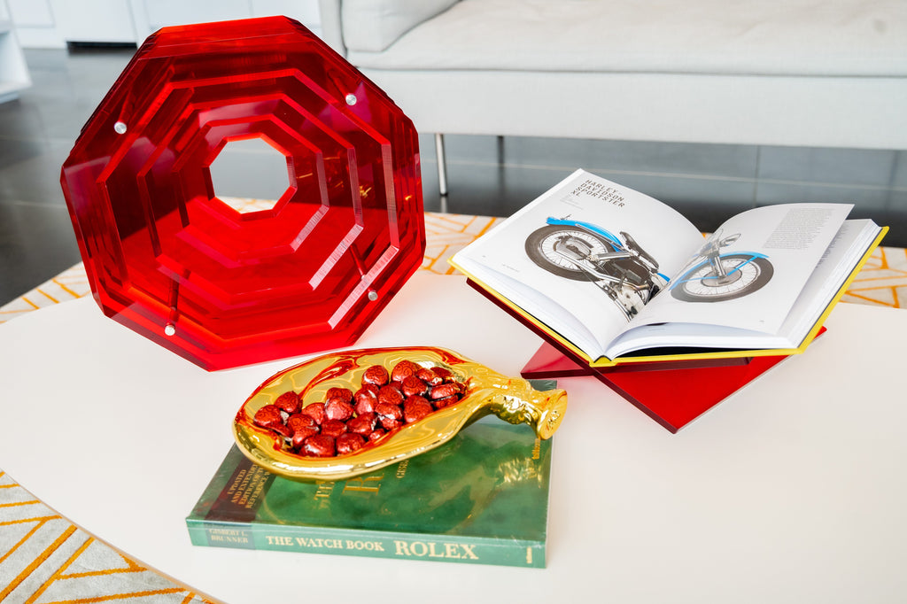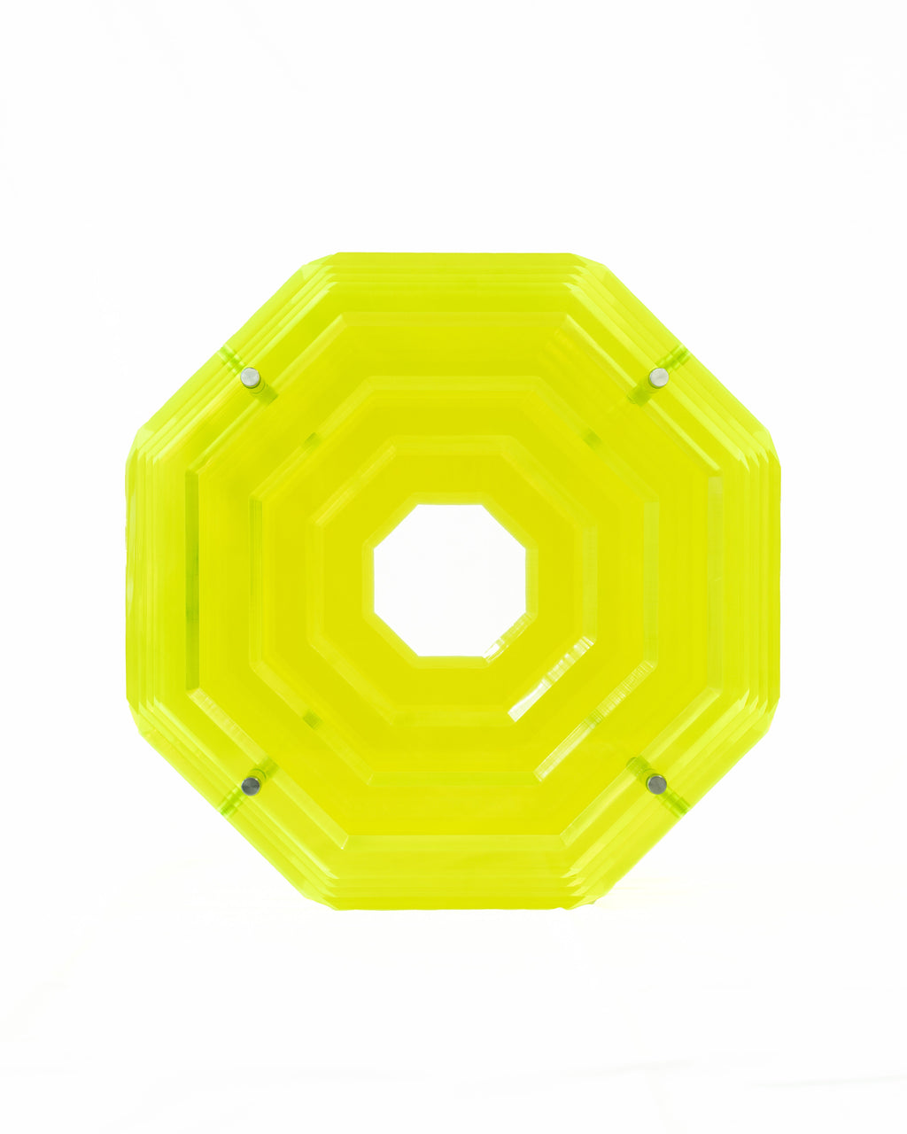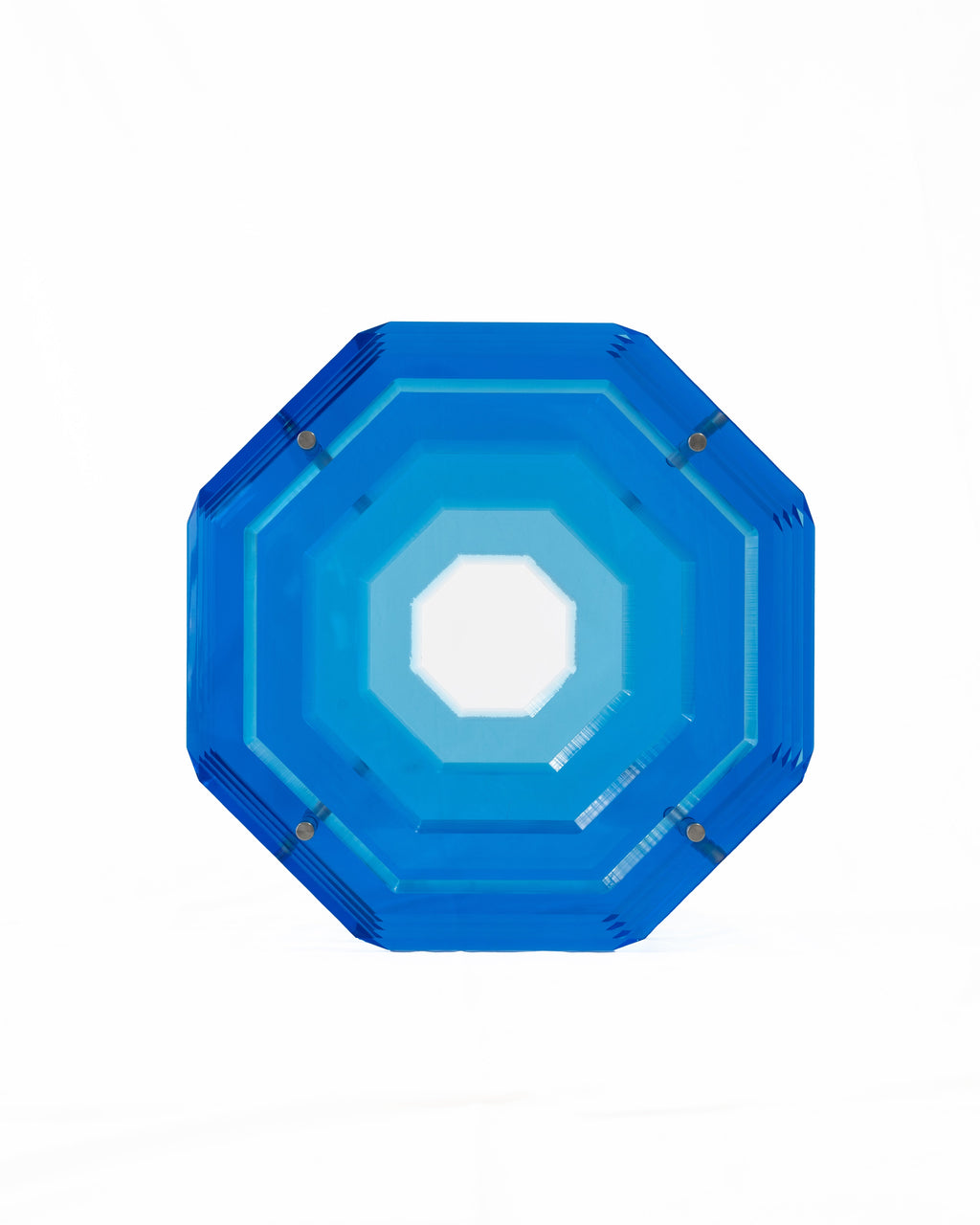 This piece is on its own, is an entire house statement. Created from the design masters at Akrylico Designs, our sculpture comes to life layering thick laminates of acrylic perfectly polished and layered into a hexagon shape.