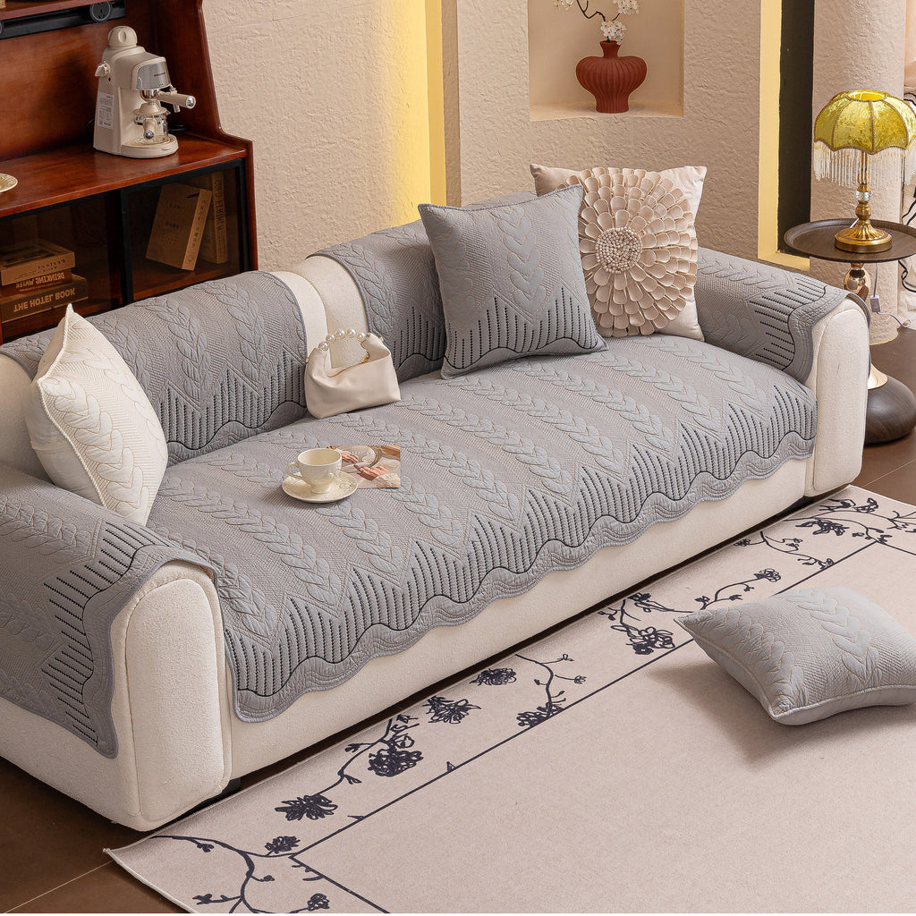 Its interior is filled with high GSM cotton padding, providing a full and cushioned feel while enhancing durability. The back is reinforced with anti-slip silicone dots to effectively grip both fabric and leather surfaces, preventing the cover from sliding. With its high craftsmanship and aesthetic appeal, this sofa cover serves as both a decorative throw and a protective layer against dust, scratches, and pet hair.