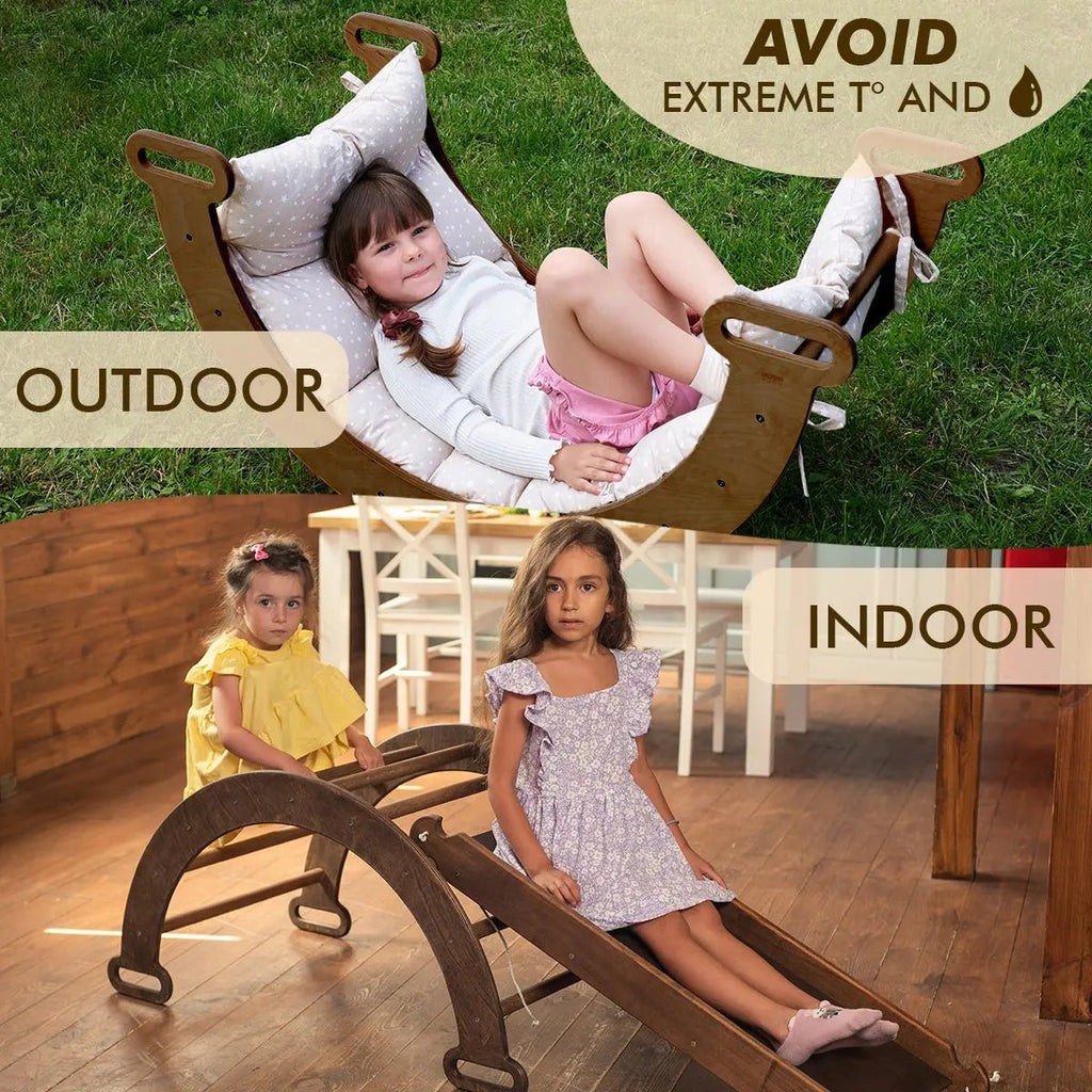 Introduce your child to the Montessori Climbing Arch & Slide/Ramp Set with our specially designed cushion, offering a plush, cloud-like surface for children to relax on as they engage in their cherished rocking activities, thoughtfully designed to promote muscle development, balance control, hand-eye coordination, and self-confidence. Adaptable and space-efficient, this set is ideal for toddlers and young children, ranging from 1 to 6-7 years old.