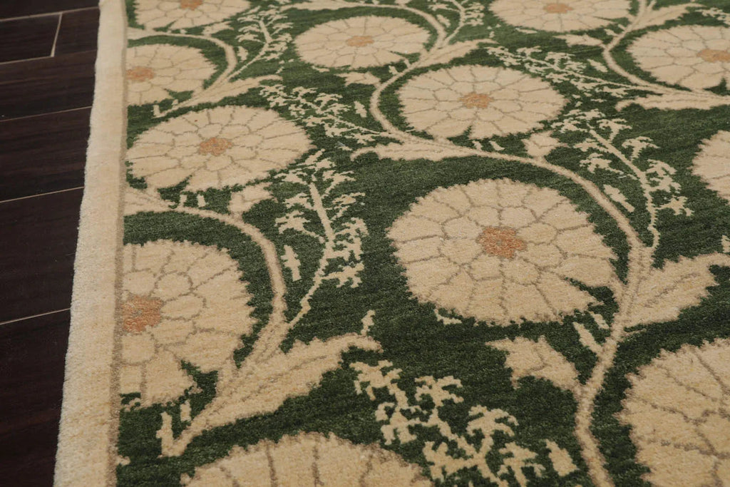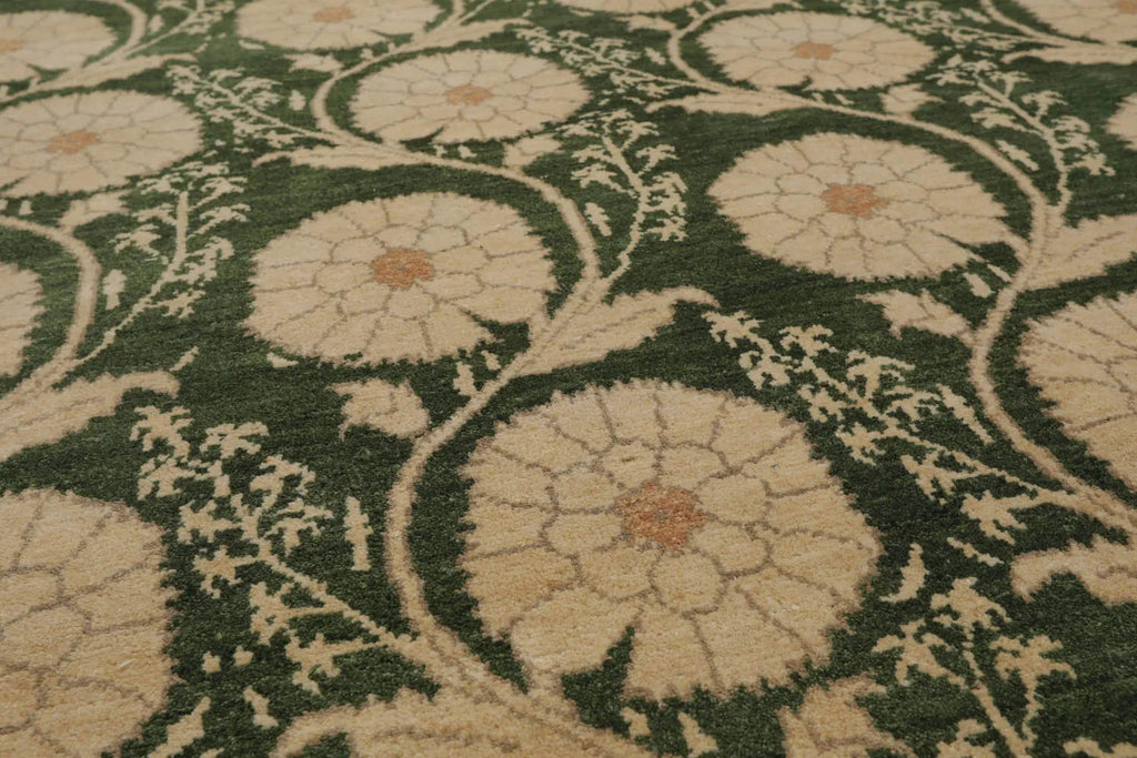 This is a beautiful Green, Beige, Tan Hand Knotted Michaelian & Kohlberg Wool Rug. The wool not only adds to rug's durability, but also provides dirt repelling quality and thermal insulation. This rug embraces the botanical elements heavy transitional pattern wholeheartedly. Its bold style is easy to decorate with and perfect for living room, dining room, bedroom or anywhere in the residence or office.