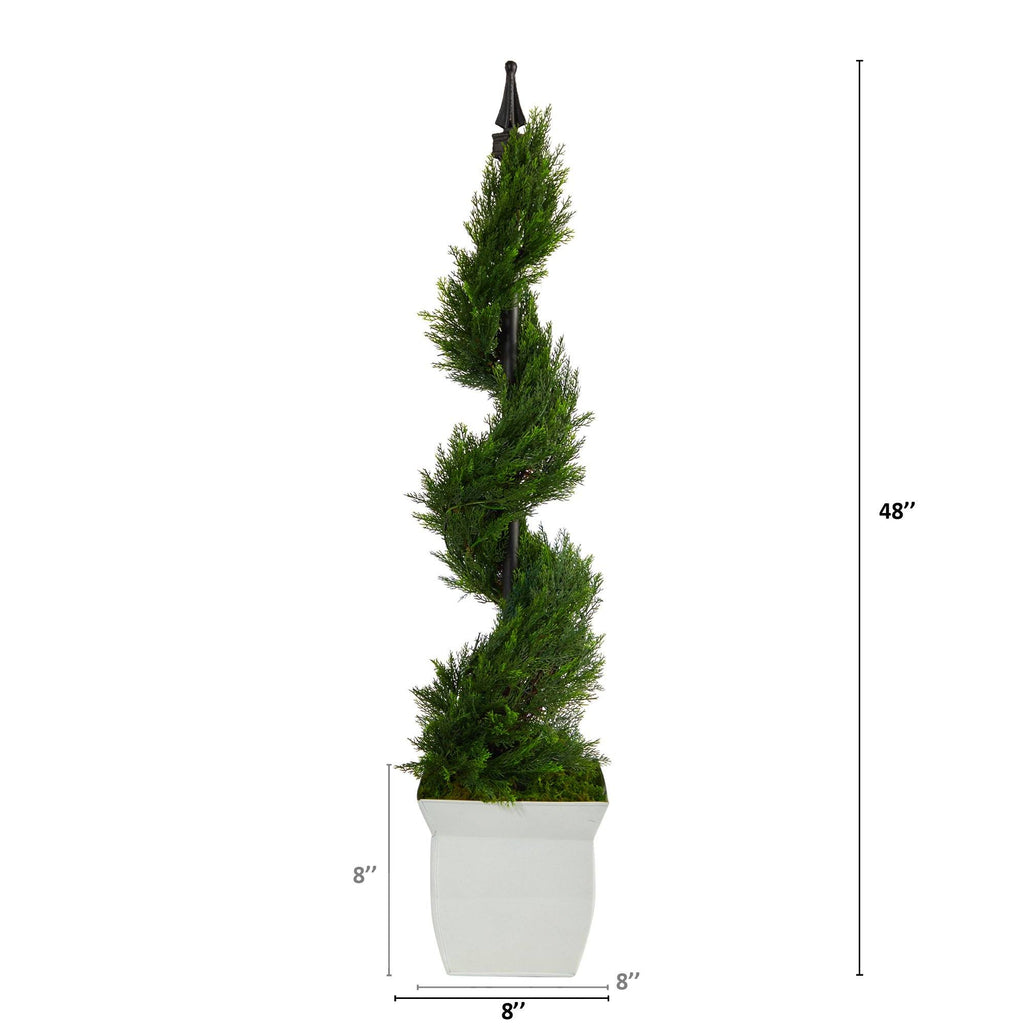 Give your spaces a twirl with this whimsical Cypress Spiral Artificial tree. The different variations of green leaves swirl around a metal pole for a fun and unique look. The think, bushy Cypress shrubs create a focal point in any area it is displayed. Standing 4’ from a white metal planter (included in height), curate in compact spaces. Get that designer look by curating horizontally in pairs.