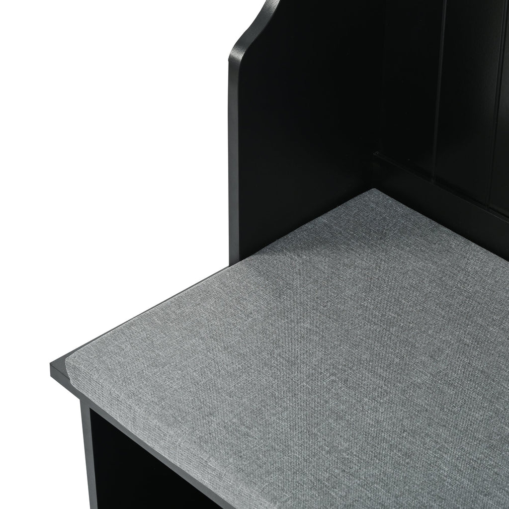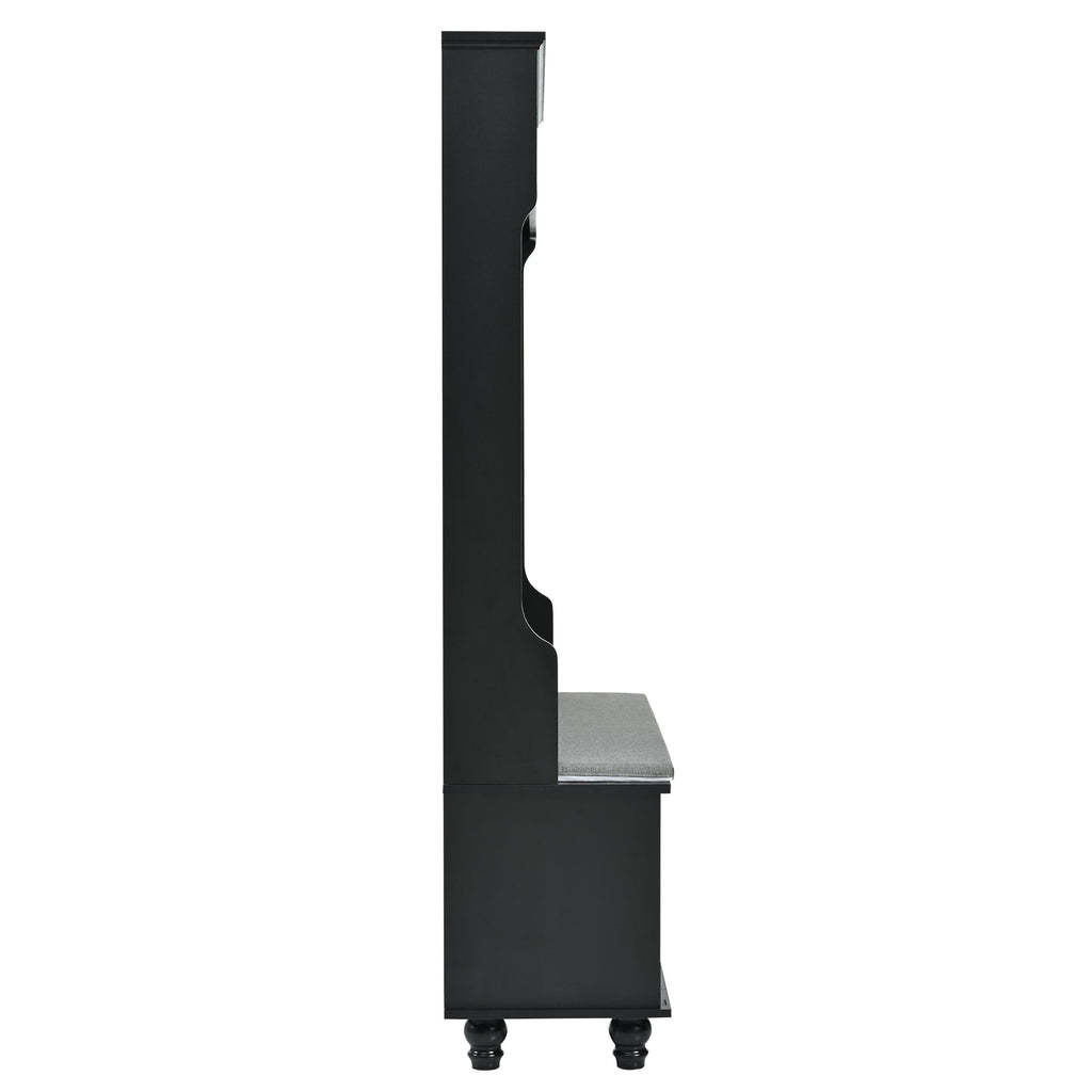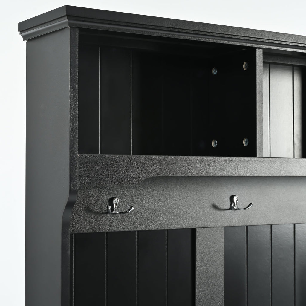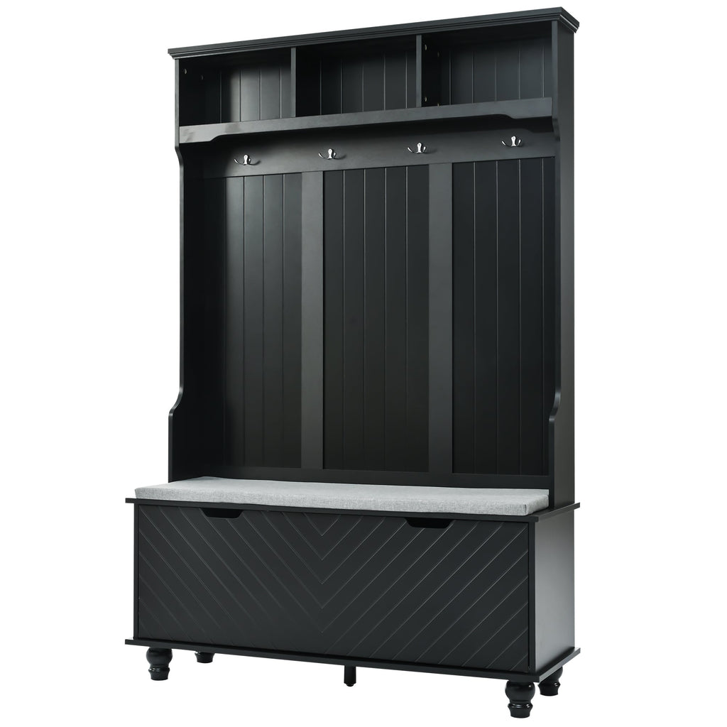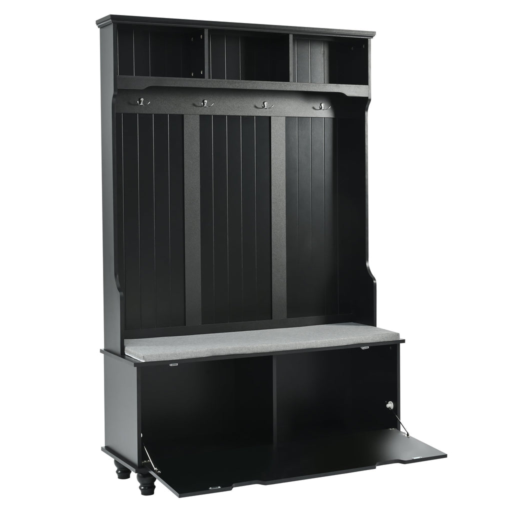 Furnish your hallway or entryway with this functional and stylish hall tree. Crafted from high quality wood, which offers a classic look and a sturdy frame that supports significant weight. It consists of 4 stable hooks for hanging coats, hats, and umbrellas. This allows you to conveniently hang your outdoor essentials and keep them easily accessible when entering or leaving your home. In addition to the hanging area, this hall tree also includes 3-open cubbies at the top, two lower cabinets, providing ample space for storing shoes, bags, scarves, and other small items. And this hall tree also has a comfortable bench with thick cushion, perfect for your entryway, living room and mudroom.