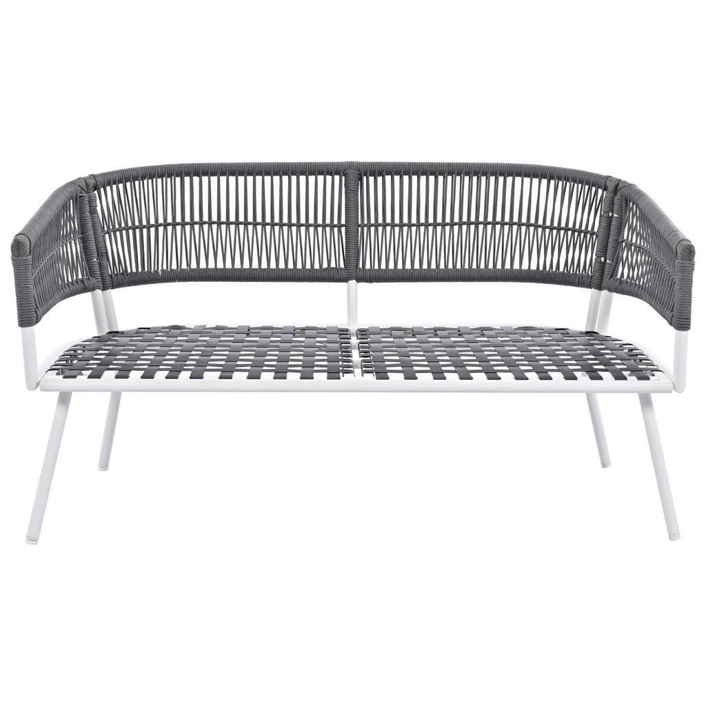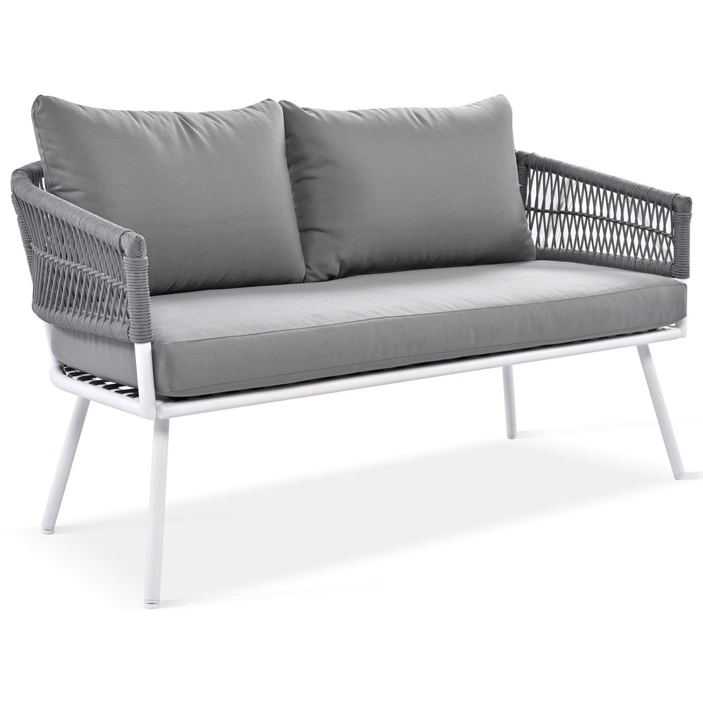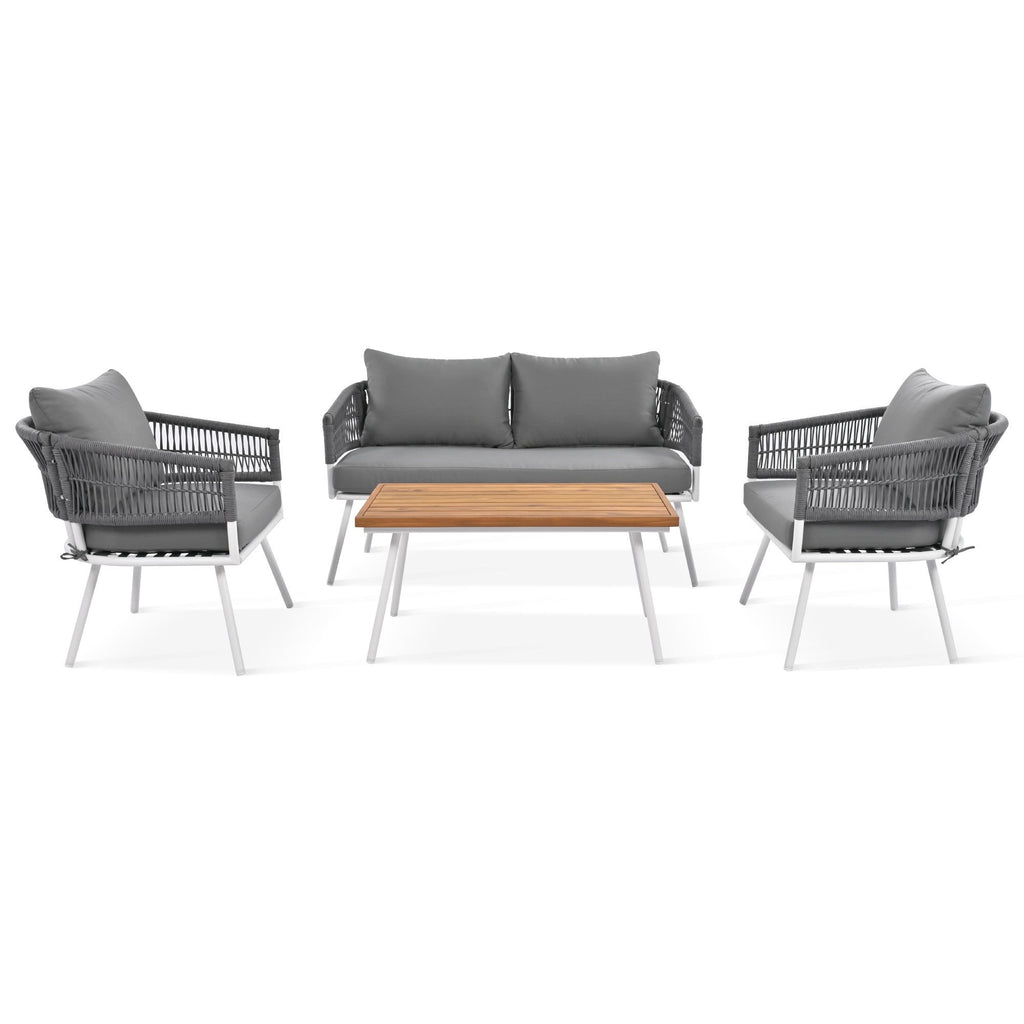 Summary This 4-piece set will give your outdoor space a fresh look that combines modern patio design with classic coastal farmhouse style. It includes one loveseat, two armchairs, and a rectangular acacia wood coffee table - all made from solid metal that's resistant to weather and water damage. The seating features open silhouettes with inviting arms and backs woven from rope for an added touch of natural charm. Plus, the machine-washable covers make clean-up after gatherings super easy!