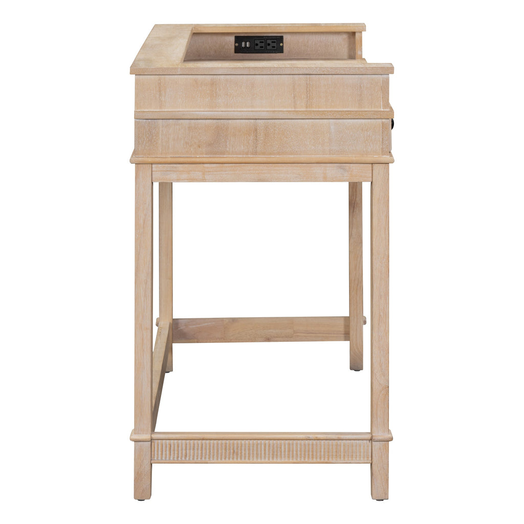 The tabletop, frame and drawers is made of MDF, and rubber wood for the legs and crossbars. The stool is made of rubber wood and sponge upholstery, which not only increases the comfort of use, but also improves the stability of the table. Table weight capacity: 595 lbs; Stool weight capacity: 330 lbs. The fence design of the tabletop better protects your items. There are two colors available for you, natural wood wash and gray, both of which will complement your decor perfectly.