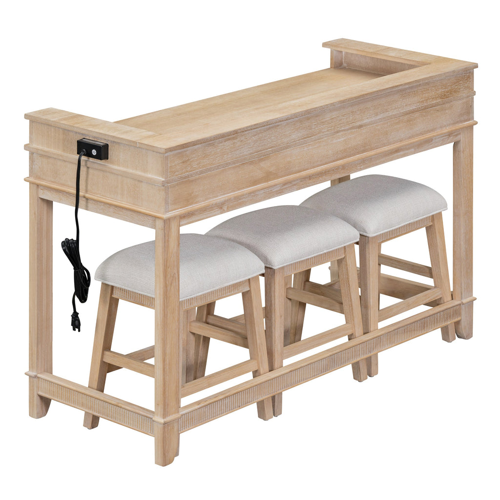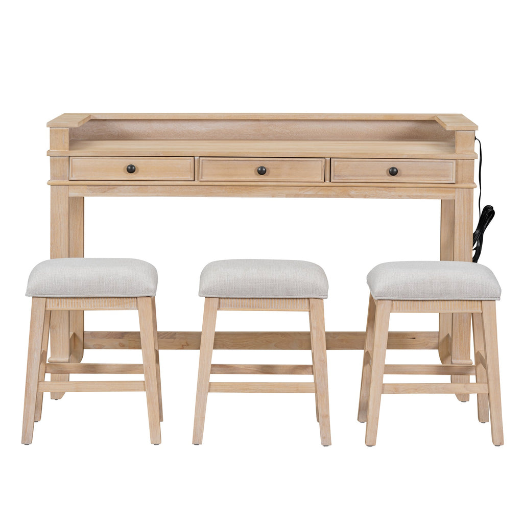 4-piece Dining Bar Table Set with 3 Upholstered Stools, Multifunctional Dining Table with 3 Drawers (Natural Wood Wash)