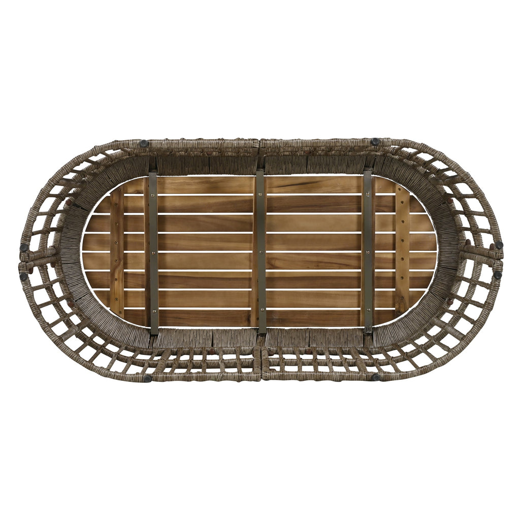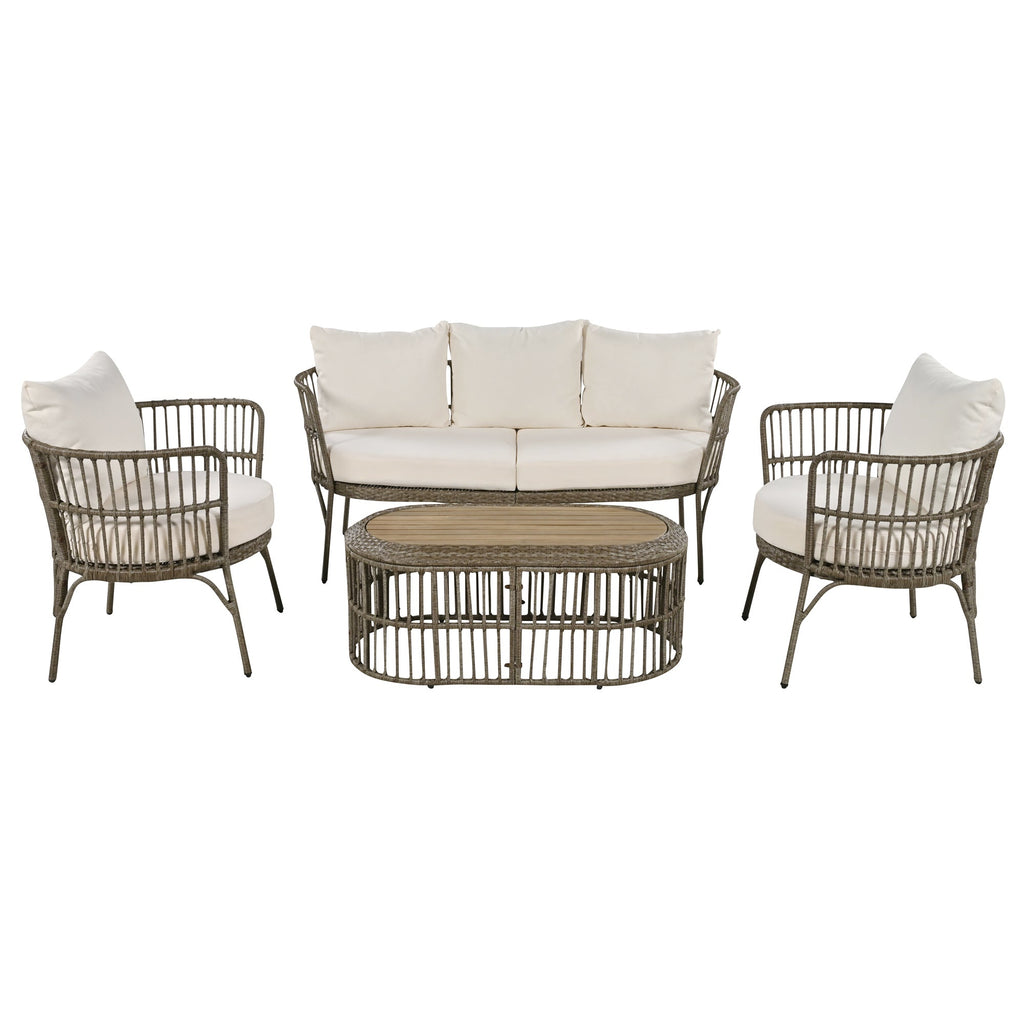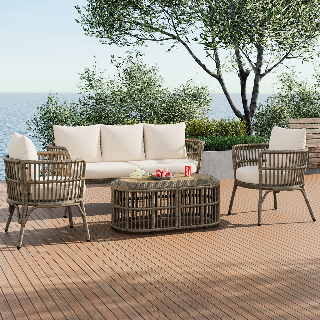 - 4-piece Outdoor Patio Conversation Set: Featuring a spacious sofa seating 3, two cozy chairs, and an oval coffee table coffee crafted from acacia wood, complement each other. Elevate your outdoor living experience with our outdoor sofa set, a sanctuary where luxury meets nature. The arc-shaped chair back design demonstrates exquisite craftsmanship and dedication to quality and detail.