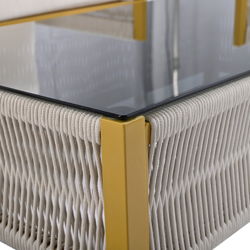 The coffee table in our patio furniture set is crafted with high-quality tempered glass and rope, perfect for holding drinks, food, and beautiful decorations.