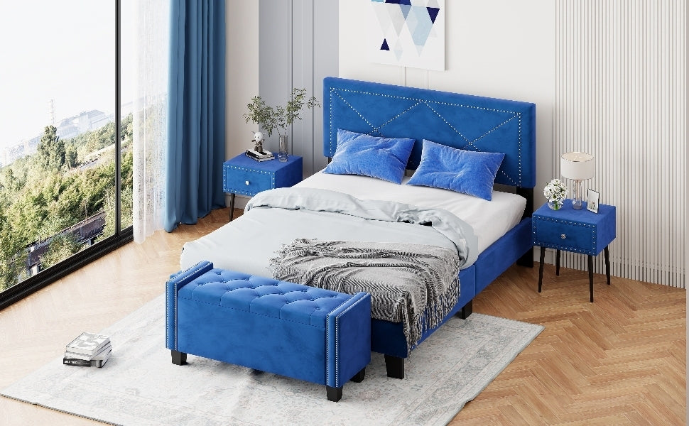 4-Pieces Bedroom Sets Queen Size Upholstered Bed Frame with Rivet Design,Nightstands and Ottoman